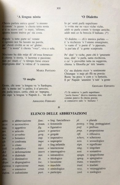 Soggetti: Lingua napoletana, Dialetto napoletano, Dialetti regionali, Dizionario napolitano-italiano, Vocabolari, Etimologia, Termini dialettali, Espressioni, Linguistica, Glottologia, Libri Vintage, Fuori catalogo, Enciclopedie, Salzano, Amato, Pardo, Andreoli, Dizionari bilingui e multilingui, Proverbi, Modi di dire, Idiomi, Lingue, Cultura popolare partenopea, Folklore, Eduardo De Filippo, Fonetica, Suoni, Lessicologia, Parlata, Accenti, Scrittura, Salvatore Di Giacomo, Pronuncia, Dittonghi, Significato, Traduzione, Grammatica, Paremiologia, Terminologia, Voci, Locuzioni, Ricerca, Storia locale, Genealogia, Localistica, Lemmi, Parole, Trasposizioni, Seicento, Settecento, Ottocento, Novecento, Grafia, Arcaismi, Linguaggio aulico, Lèngua nòsta, Parlare, Napule, Bibliografia, Sinonimi, Contrari, Canzone, Autori, Letteratura, Indici, Glossario, Abbreviazioni, Campania, Nozioni, Metrica, Poesia, Rimario, Ferdinando Galiani, Francesco Mazzarella Farao, Semantica, D'Ascoli, Malavita Napoletana, Poeti Napoletani, Cinti, Bertoldi, Cortese, Nomenclatura, Benedetto Croce, Arti, Mestieri, Lucio D'ambra, Lo Vernacchio, Lessico, Proverbi, Viviani, Gergo, Camorra, Mangianapoli, Gargano, Pulcinella, Commedia dell'arte, Onomatopee, Prati, Canti Popolari, Imperatore, Diavolo e L'acqua Santa, Neapolitan language, Neapolitan dialect, Regional dilettantes, Neapolitan-Italian dictionary, Vocabularies, Etymology, Dialectal terms, Expressions, Linguistics, Glottology, Out of print books, Encyclopedias, Bilingual and multilingual dictionaries, Proverbs, Sayings, Idioms, Languages, Popular culture Neapolitan, Phonetics, Sounds, Lexicology, Speech, Accents, Writing, Pronunciation, Diphthongs, Meaning, Translation, Grammar, Paremiology, Terminology, Voices, Locutions, Research, Local history, Genealogy, Localism, Lemmas, Words, Transpositions, Seventeenth, Eighteenth Century, Nineteenth century, Twentieth century, Handwriting, Archaisms, Courtly Language, Bibliography, Synonyms, Antonyms, Songs, Authors, Literature, Indices, Glossary, Abbreviations, Notions, Metric, Poetry, Semantics