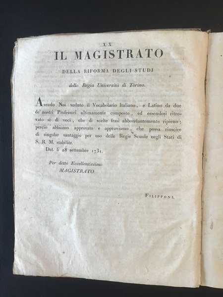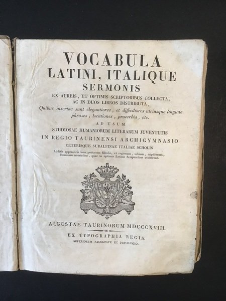 EX AUREIS, ET OPTIMIS SCRIPTORIBUS COLLECTA, AC IN DUOS LIBROS DISTRIBUTA, QUIBUS INSERTAE SUNT ELEGANTIORES, ET DIFFICILIORES UTRIUSQUE LINGUAE PHRASES , LOCUTIONES, PROVERBIA, ETC. AD USUM STUDIOSAE HUMANIORUM LITERARUM JUVENTUTIS IN REGIO TAURINENSI ARCHIGYMNASIO. Dizionario latino - italiano