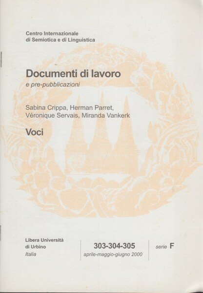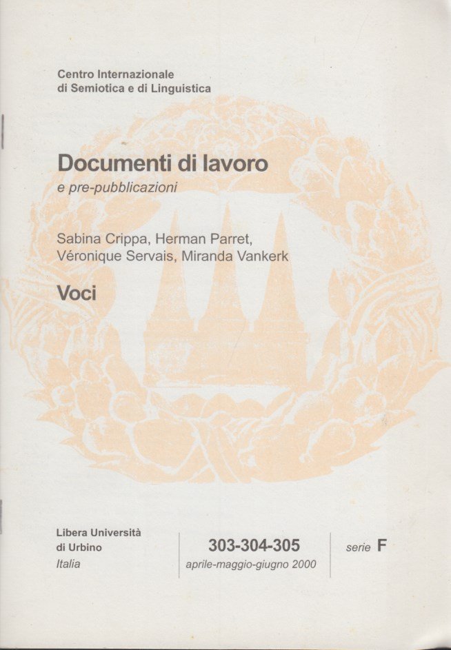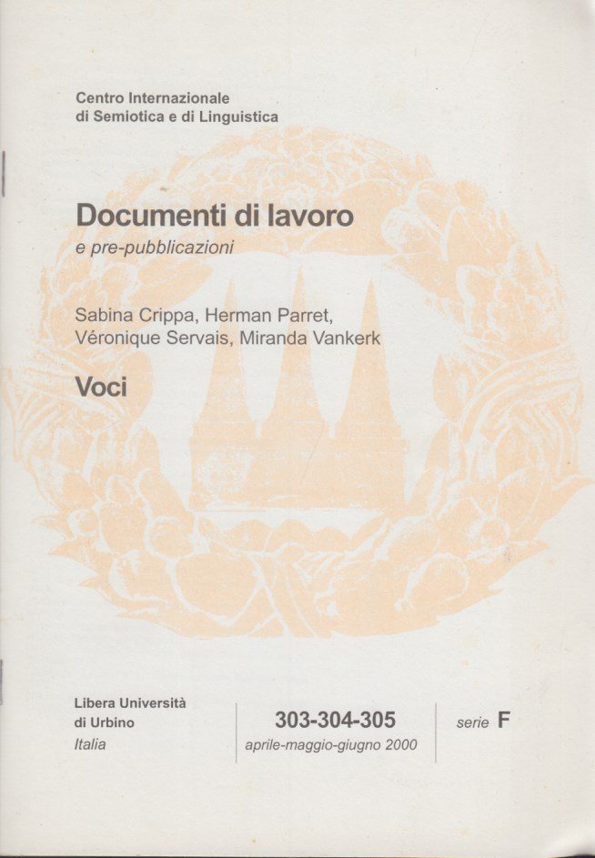 In-8 (Cm 24 x 17), pp. 49 brossura editoriale. Collana Documenti di lavoro e pre-pubblicazioni 303-304-305 Aprile, Maggio, Giugno 2000 serie F (Semiotiche visive e audio-visive). OTTIMO - Esquisse di una teologia della voce in Grecia antica - Voci in Paradiso - Voci animali e animalità della voce - La voce lacaniana: desiderio, appello, angoscia.