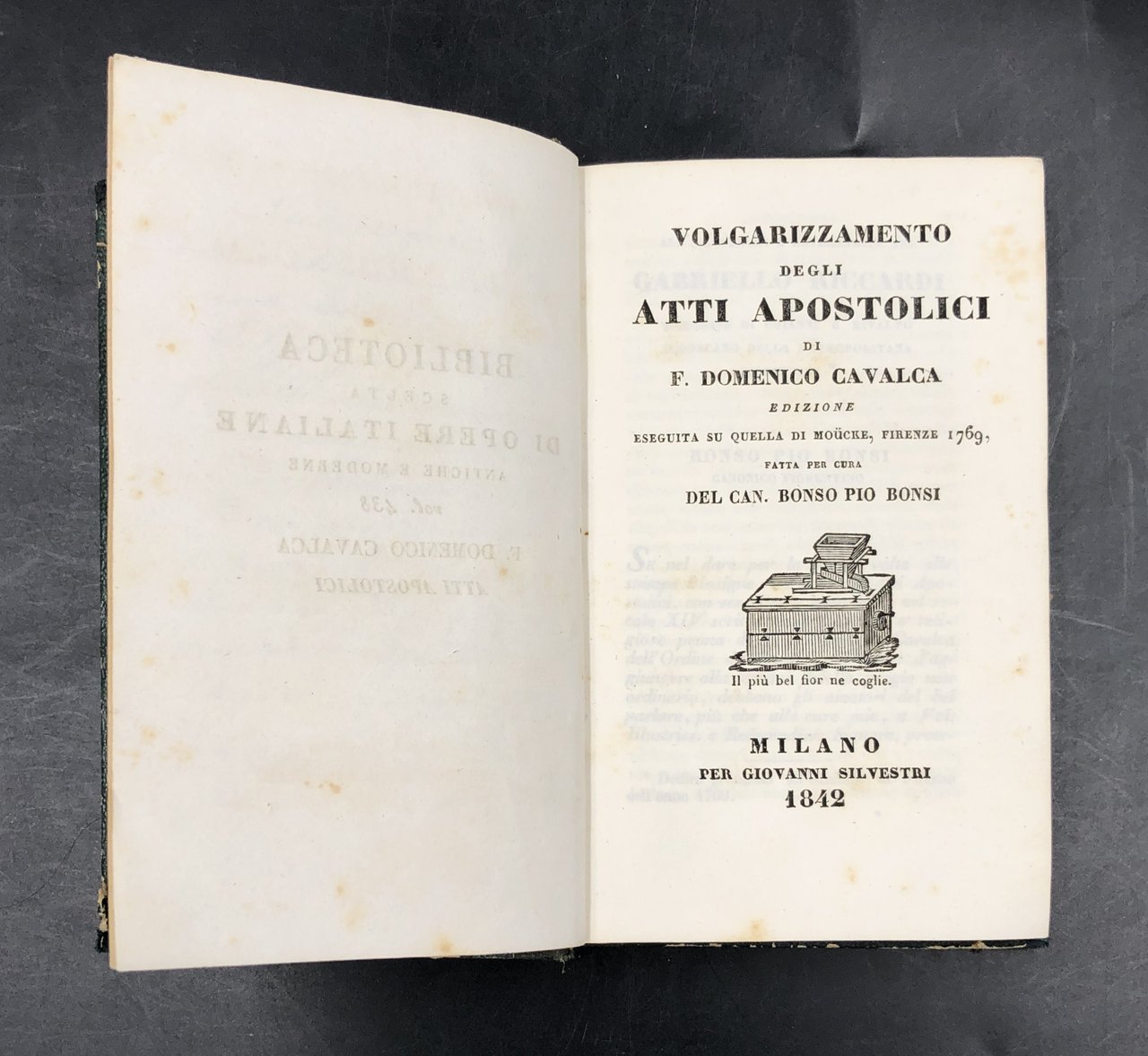 VOLGARIZZAMENTO degli ATTI APOSTOLICI. Ed. eseguita su quella di Moucke , Firenze 1769 , fatta per cura del Can. Bonso Pio BONSI. Unito: BREVI NOTIZIE dei PRINCIPALI SCRITTORI ITALIANI di Giuseppe Ignazio MONTANARI.