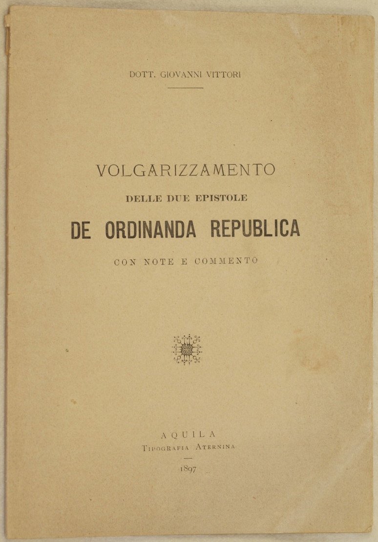 In 8. Dim. 22,5x16 cm. Pp. 43+(3).Interessante pubblicazione del 1897 sul volgarizzamento delle due epistole De Ordinanda Republica scritto dal Dott. Giovanni Vittori. Testo italiano con note e commento. Firma al frontespizio. In buone condizioni. Copertina editoriale in buone condizioni generali con lievi usure ai margini e dorso. Legatura in buone condizioni. All'interno le pagine si presentano in buone condizioni con rare fioriture.Interesting pamphlet of 1897 abotut he italian translation of the two letters De Ordinanda Republica written by Giovanni Vittori. Italian text with notes and comments. Signature in the title page. In good conditions. Editorial cover in good general conditions slightly worn in the edges and spine. Binding in good conditions. Inside pages are in good conditions with occasional foxings.