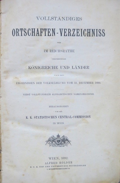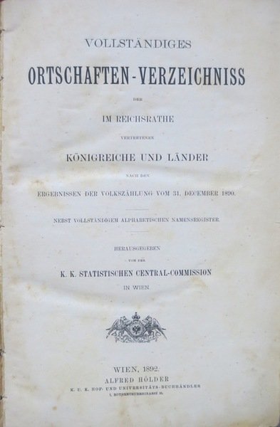 Vollständiges Ortschaften - Verzeichniss der im Reichsrathe vertretenen Königreiche und Länder nach den Ergebnissen der Volkszählung vom 31. December 1890. Nebst vollständigem alphabetischen Namensregister. Hrsg. von der k.k. statistischen Zentral-Commission in Wien.