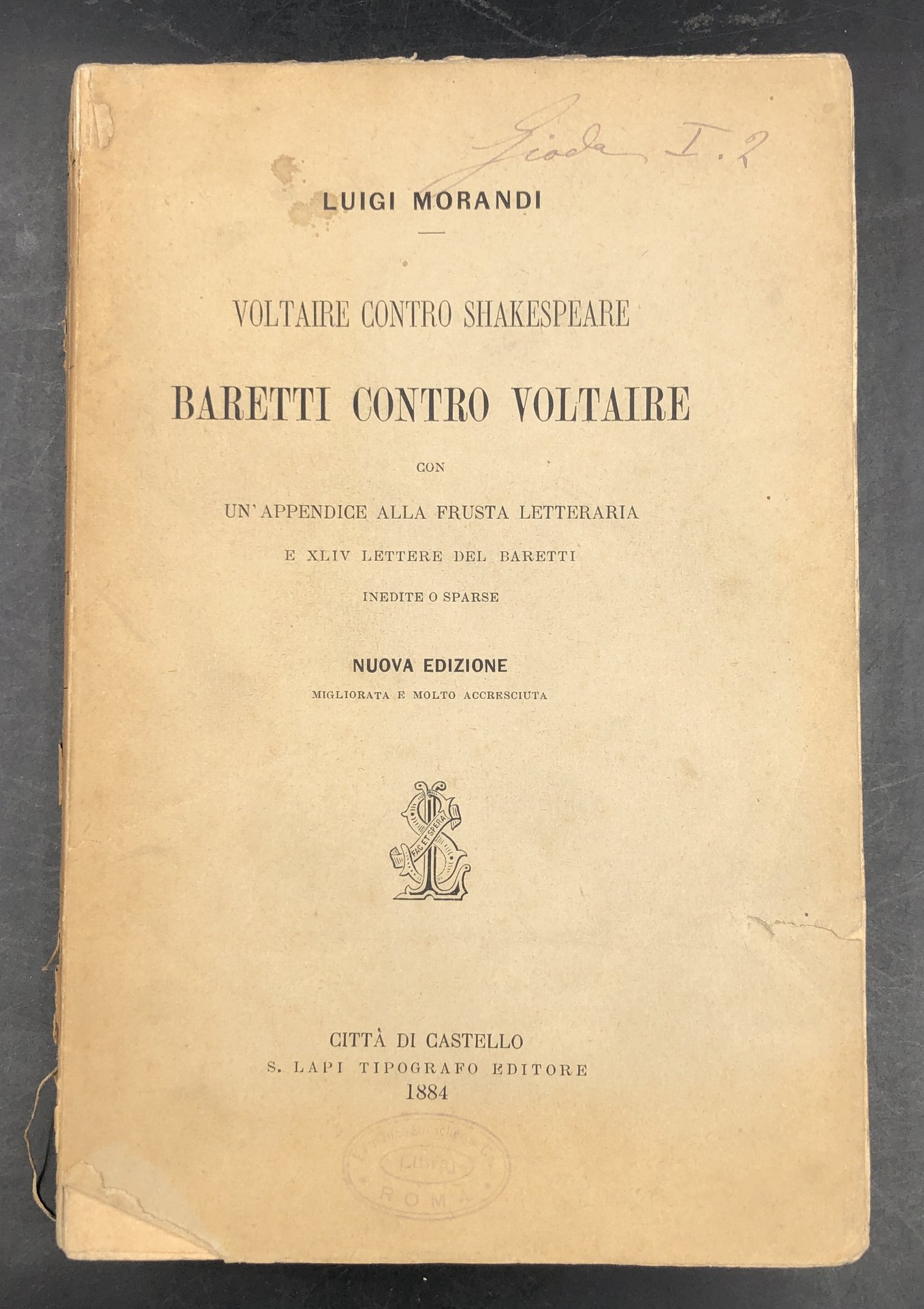 VOLTAIRE contro SHAKESPEARE. BARETTI contro VOLTAIRE. Con un'appendice alla Frusta letteraria e 44 LETTERE del Baretti INEDITE o sparse. Nuova ed. migliorata e molto accresciuta.