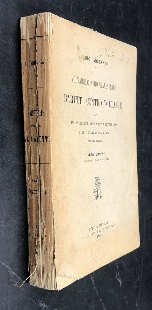 In.16° grande (cm. 18,9x12m5m pp. (2), 356, (1), All'occhietto altro tit.: Ricerche intorno al Baretti; e DEDICA AUTOGRAFA FIRMATA dell'Autore a Carlo Gioda. Bross. edi. nelle sue barbe, fessura spacca il dorso, parzialmente sciolto, strappetto in cop. e a un foglio. Dedica a stampa a Giuseppe SAREDO e Augusto FRANCHETTI. MORANDI (Todi 1844- Roma 1922), volontario garibaldino (a Mentana soccorse Garibaldi da cui fu iniziato alla Massoneria). scrittore, grammmatico e linguista manzoniano, maestro, fondò scuole serali (gestiva anche una tabaccheria), una banca popolare,e fondò le primissime biblioteche per il Popolo, dette "circolanti", pubblicò sui dialetti dell'Italia Centrale, una raccolta di canti popolari umbri e soprattutto la prima edizione quasi integrale dei sonetti romaneschi di Giuseppe Gioachino Belli.