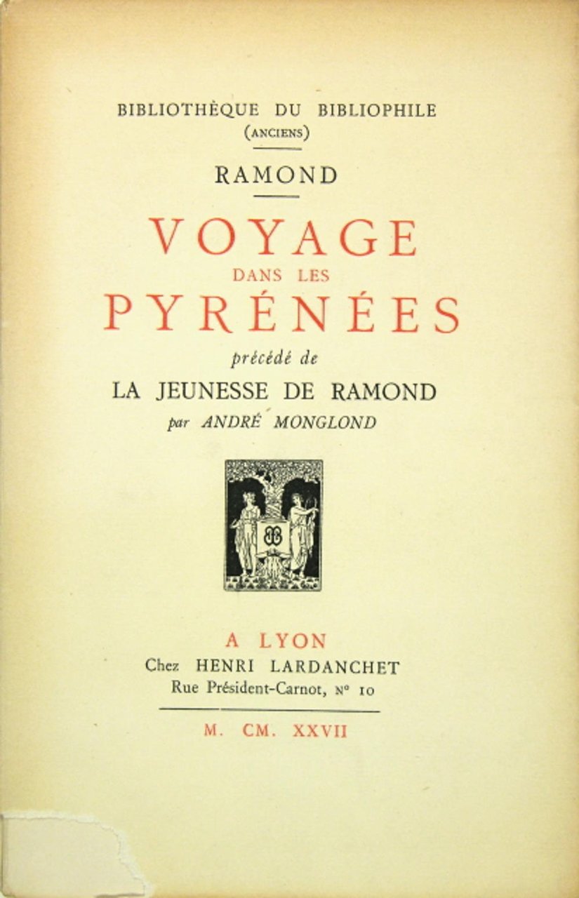 Lardanchet, Lyon, 1927. In/8 broché, couverture rempliée, quelques illustrations hors-texte, 206 pages. Exemplaire non coupé, numéroté sur vergé d’Arches teinté. Un manque sur le dos et déchirure sur la couverture sans manque. Ramond de Carbonnieres Louis François 1755-1827 Il est considéré comme l'un des premiers explorateurs de la haute montagne pyrénéenne pouvant être qualifié de pyrénéiste.