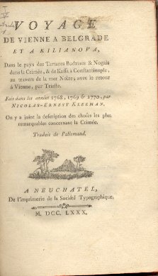 Voyage de Vienne a Belgrade et a Kilianova, dans le pays des Tartares Budziacs e Nogais dans la Crimee e de Kaffa a Constantinople, au travers de la mer Noire; avec le retour a Vienne, par Trieste. Fait dans les annees 1768, 1769 e 1770 . On y a joint la description des choses les plus remarquables concernant la Crimee.