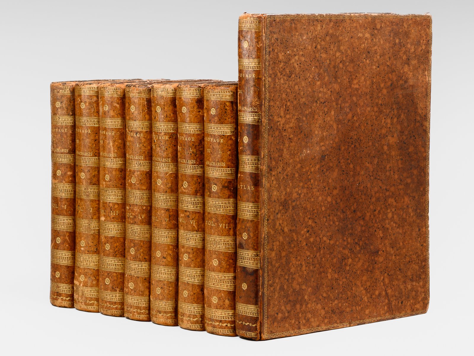 Quatrième édition ("Nouvelle Edition" pour l'Atlas) 7 vol. in-8 et 1 vol. d'atlas in-4 reliure de l'époque plein veau moucheté, dos lisses ornés (petits fleurons), grecque dorée en encadrements sur plats, filet sur coupes, De l'Imprimerie de Didot Jeune, Paris, l'an Septième [ 1799-1800], viii-clij-367 pp. avec portrait en frontispice ; VIII-517 pp. ; VIII-496 pp. ; VIII-507 pp. ; VIII-495 pp. ; 3 ff., 454 pp. ; Atlas : 110 pp., avec 39 carte dont carte dépliante ("La Grèce et ses Isles pour le Voyage du Jeune Anacharsis" par J. D. Barbié du Bocage, Août 1788) et vues rehaussées au pastel Exemplaire décoratif, signé par l'éditeur Didot le jeune, dont l'atlas recueille 39 belles cartes et vues sans la première carte dépliante de la Grèce, qui manque souvent car parue tardivement, mais avec le numéro 19 bis non signalé dans la table. On trouve le portrait de l'abbé Barthélémy dans le premier volume de texte, mais pas dans l'atlas. La plupart des vues ont été légèrement rehaussées au pastel, ce qui est d'un bel effet, certaines cartes sont légèrement rehaussées en couleurs. On relève plusieurs travaux de restaurations anciens, les gardes volantes ont été systématiquement contrecollées sur les gardes fixes et certains feuillets ont été maladroitement remontés, mais l'ensemble reste agréable (qq. frott. en reliure., traces d'anciennes mouill. en dos de l'atlas, anciennes restaurations signalées, bon état par ailleurs).