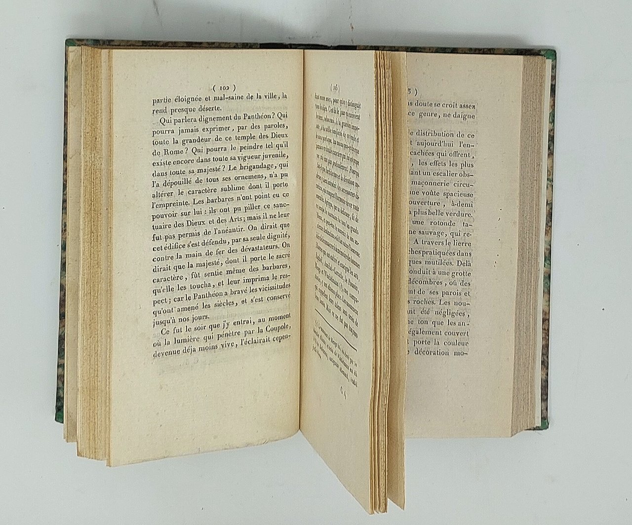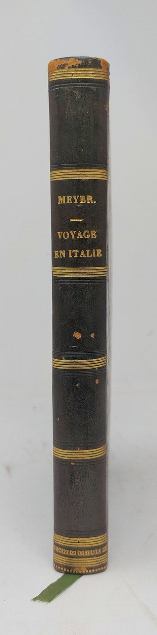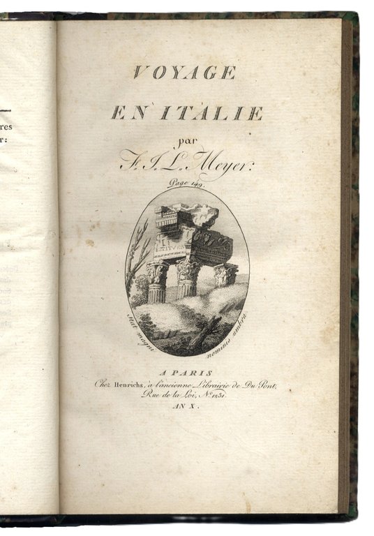 >in-8, pp. XIV, 424, leg. del tempo m. pelle, titolo e fregi oro al dorso. Titolo inciso con vignetta. Prima traduzione francese di Ch. Vanderbourg del ''Darstellungen aus Italien'' (Berlin, 1792), relazione artistico-descrittiva del viaggio nelle regioni e città d'Italia (Verona, Vicenza, Padova, Venezia Ferrara, Ancona, Loreto, Roma e dintorni (Tivoli, Frascati, Albano), Napoli e Campi Flegrei. Non comune. Bell'esemplare, fresco e marginoso (lievissimi aloni d'umido alle prime e ultime carte, minime mancanze agli angoli inferiori degli ultimi 2 ff.). D'Ancona 660. Fossati-Bellani 427.