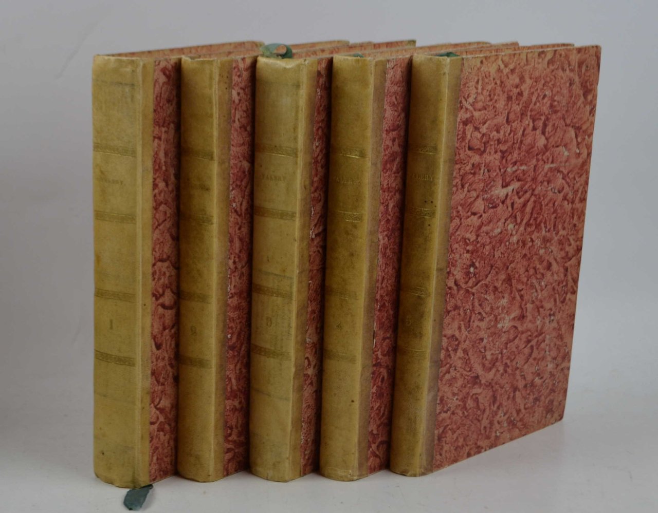 Cinque volumi di cm. 21, pp. 2.000 ca. complessive. Solida ed elegante legatura coeva in mezza pergamena, dorsi lisci con titoli e fregi in oro. Piatti in carta decorata. Esemplare genuino, marginoso ed in ottimo stato di conservazione. Edizione originale, non comune. Olschki (685) che cita l'edizione del 1835 e afferma: "Compilazione molto dettagliata, senza date precise, di viaggi che non arrivano oltre Napoli e dintorni. Preziose per la consultazione le Table des Matières e la Table Analytique". Cfr. anche Fossati-Bellani e Borroni.