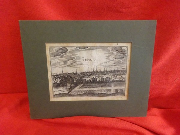 S.l., Tassin ?, vers 1700; 105/155 mm, 1 pp., une feuille, dans une marie-louise. Vue de Rennes au premier plan des maraichers. Il est étonnant de constaté que c'est presque une copie de la gravure de Mérian, mais en plus petit format. Bon état.