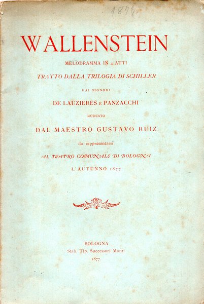 Libretto d’opera. Teatro Comunale di Bologna, Autunno 1877. Elenco dei personaggi completo dei nomi degli interpreti tra cui Giuseppina Musiani e Augusto Souvestre. Prima rappresentazione