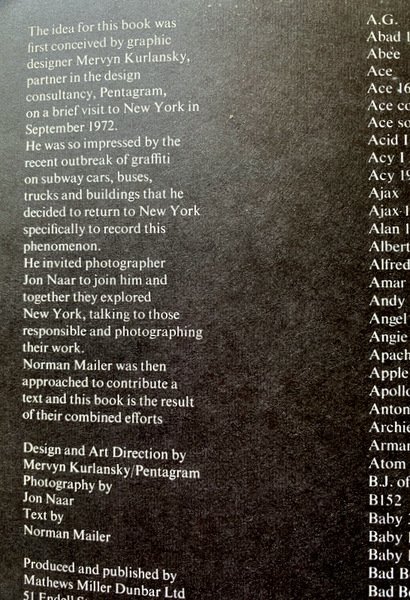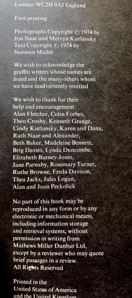 Riproduzioni fotografiche a colori della Street Art Newyorkese, accompagnate dai testi/saggi di Norman Mailer. Pubblicato per la prima volta a New York con il titolo The Faith of Graffiti. Prima edizione britannica (prima stampa).