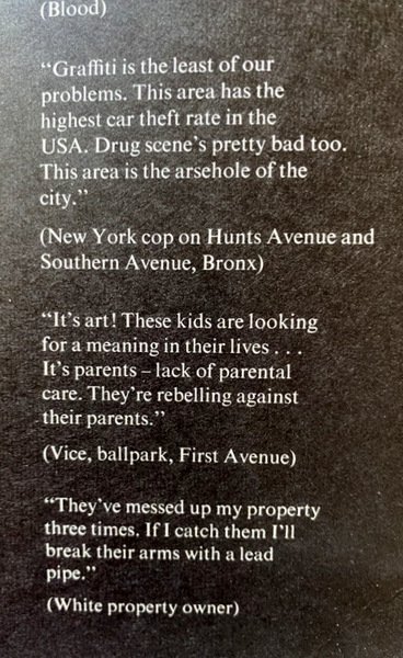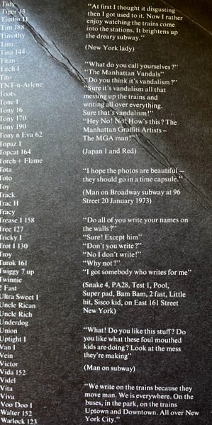 Soggetti: Fotografia, Grafica, Graffitismo, Graffiti metropolitani, Anni Settanta, Fotografi newyorkesi, Artisti, Arte di Strada, Pittura murale, Scritte sui muri, Murales, Photographers from New York City, Exhibitions, Fine Arts, Les Graffitis, Wooster Collective, Old school, Grande mela, Bronx, Writing, Creatività, Interventi pittorici sul tessuto urbano, Graffitisti, Bomboletta, Spray-can art, Collezionismo, Libri illustrati da collezione, Rarità, Chicche librarie, Raccolte fotografiche, Tecniche di riproduzione, Stili, Wild Style, Bomb-style, Throw up, Metropolitana, Firme, Contorno, Cartoni animati, Puppets, Logo, Aerosol-art, Design, Cultura alternativa, Underground, Giovani, Sottoculture, Treni, Vagoni, Spazio urbano, Linguaggio giovanile, Poetica della rivolta, Autobus, Camion, Edifici, Sottopassaggi, Elenco di nomi, Reportage fotografici, Giornalismo, Cay form 161 Street, Rammellzee, TAKI 183, JUNIOR 161, Pastels, Robert Rauschenberg, JAPAN I, Socono, Tang, Tag, Super Kool 223, Julio 204, Alter ego, Pop, Flame, Lurk, Ribellione giovanile, Rabbia, Pensiero controcorrente, Moda, Disegni urbani, Vandalismo, Copyright, Photography, Graphics, Metropolitan Graffiti, Seventies, American Photographers, Artists, Street Art, Mural Painting, Wall Lettering, Murals, Big Apple, Creativity, Painting on urban fabric, Graffiti artists, Collectibles, Books illustrated by Collection, Rarities, Book goodies, Photographic collections, Reproduction techniques, Styles, Underground, Signatures, Outline, Cartoons, Alternative culture, Youths, Subcultures, Trains, Wagons, Urban space, Youth language, Poetics of revolt, Buses, Trucks, Buildings, Underpasses, List of names, Photo reports, Journalism, Youth rebellion, Anger, Counter-current thinking, Fashion, Urban drawings, Vandalism, LI'L, Interviste