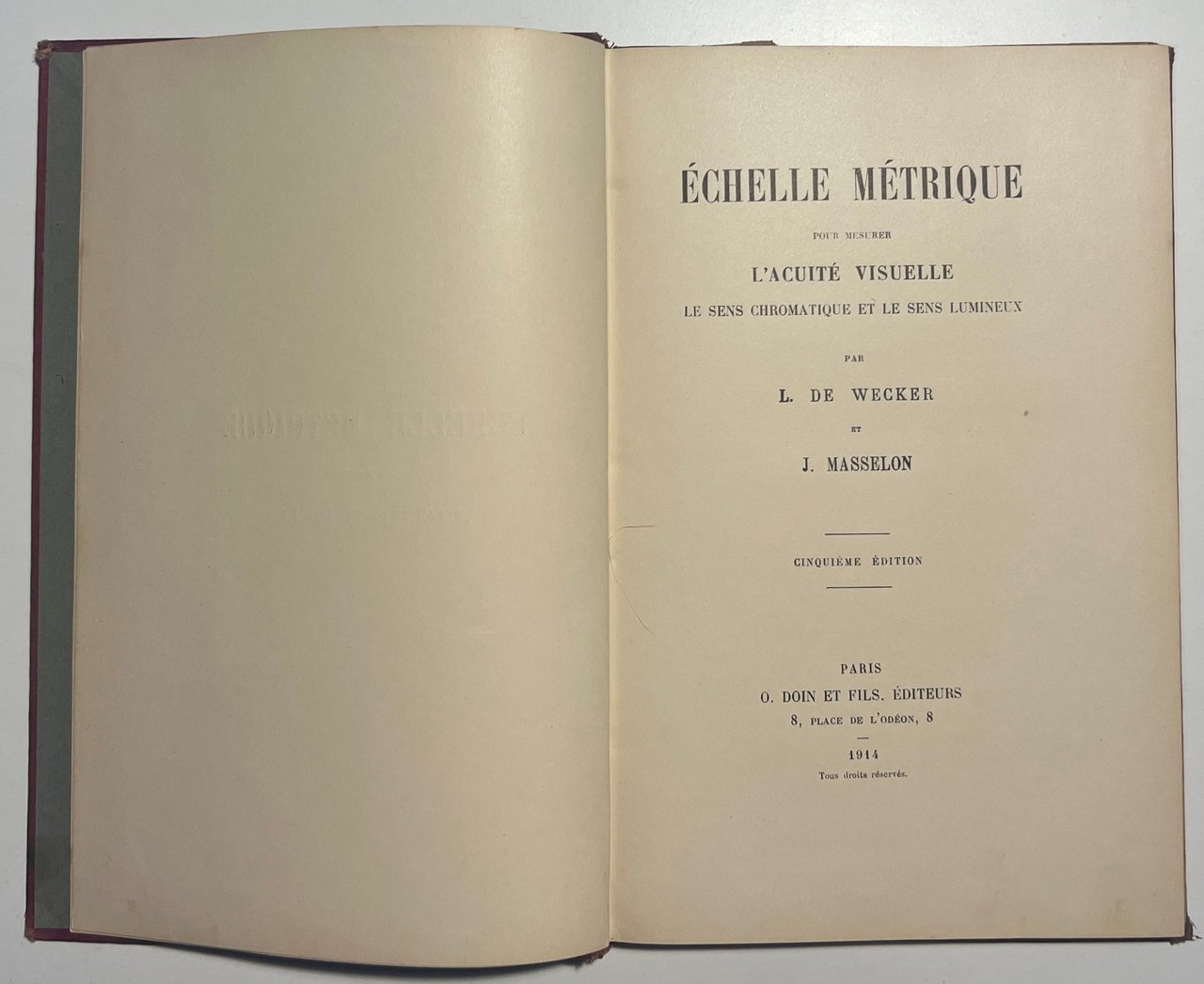 L. De Wecker et J. Masselon - Échelle Métrique pour mesurer l'Acuité Visuelle - ed. 1914 Testo in lingua francese. Pagine 80 ca. con diverse tavole. Copertina rigida. Condizioni generali buone, copertina con piccoli segni del tempo come da foto.