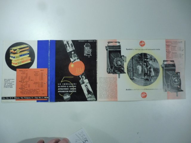 Pieghevole a 4 falde, cm 49 x 16,5, immagini a colori. Bella grafica di ispirazione modernista. Presenta l'apparecchio Guchi (apparecchio in miniatura), il Dubla (a lastre), Perle (per dilettanti), Symbol