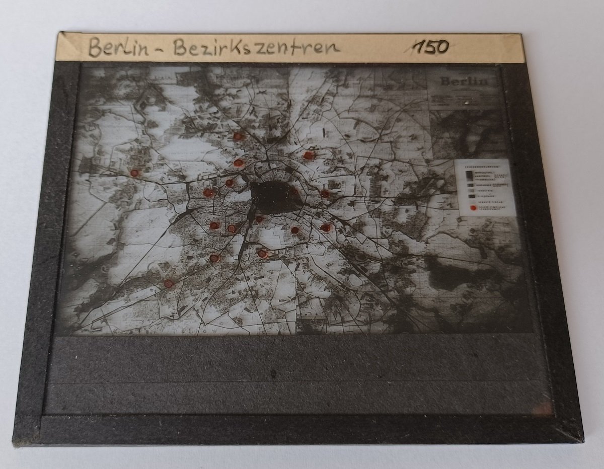 Das Diapositiv (Glasplatte) enthält Westermanns Berlin-Plan aus dem Jahr 1937 in sehr detaillierter Form. Der Plan wurde in der Berliner Stadtplanung wohl auch nach 1945 noch verwendet aufgrund seiner Übersicht aus der Vorkriegszeit. Beschriftet wurde er handschriftlich nach 1945 mit "Berlin - Bezirkszentren". Der Plan ist schwarz/weiss und enthält neben Legende und zusätzlichem Plan-Ausschnitt (oben rechts) eine Markierung der sogenannten "Neuen Städtischen Schwerpunkte" (einzelne Bezirke). Sehr interessanter Plan Berlins vor 1945! ################## LIEBE KUNDEN, WIR MACHEN UNSERE JÄHRLICHE FRÜHLINGSAKTION MIT 30% RABATT AUF DEN GESAMTEN BESTAND. DIE ERMÄSSIGUNG GILT AB SOFORT, DER RABATT WIRD NACH IHRER BESTELLUNG VON DEN PREISEN ABGEZOGEN UND SIE ERHALTEN DEN ENDBETRAG VON UNS. ÜBER IHR INTERESSE AN UNSEREN SELTENEN STÜCKEN WÜRDEN WIR UNS WIE JEDES JAHR SEHR FREUEN ###################