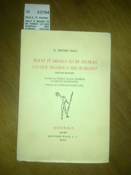 HALL, N. Jerome WHAT IT MEANS TO BE HUMAN. LO QUE SIGNIFICA SER HUMANO. EDICION BILINGUE. VERSION DE MARIA JULIA, RAMON Y CARLOS MURCIANO. PROLOGO DE CARLOS MURCIANO. Coleccion 356-357 Adonais. Rialp. Madrid 1978 87 p. (18 cm) Rustica. Intonso. Con sello ant. prop. english & spanish M (Ref.33794) poesia ingles nashville tennesse estados unidos