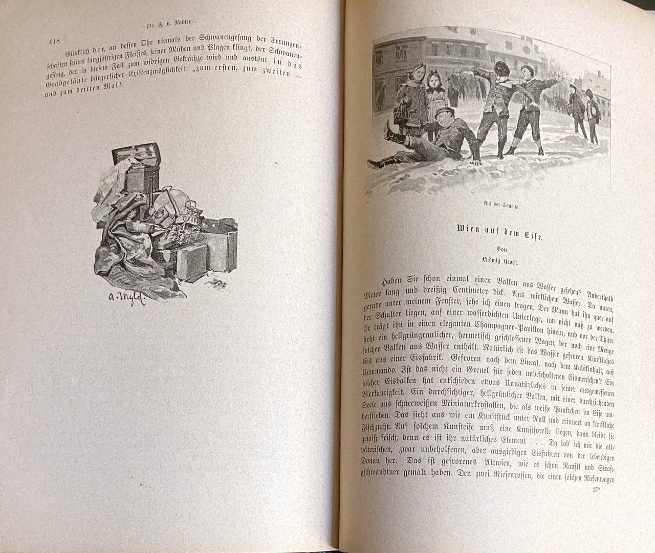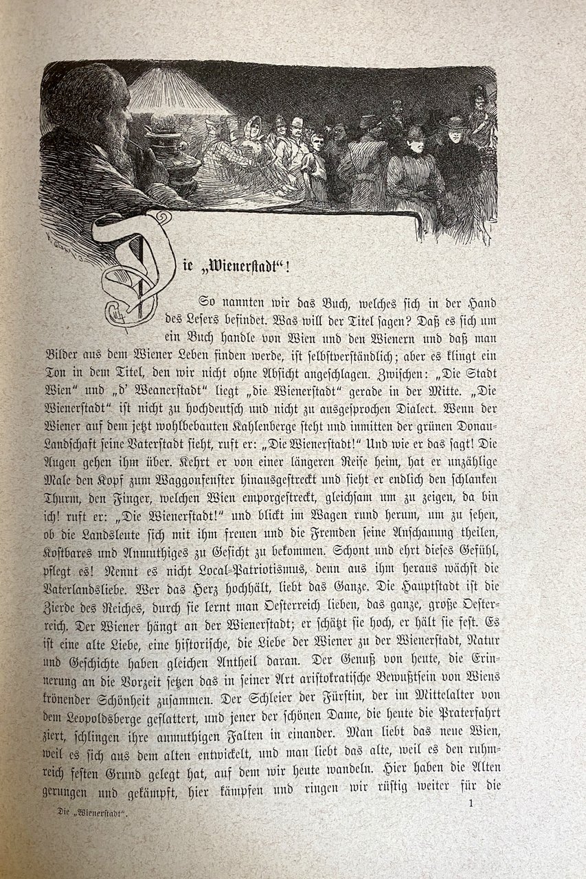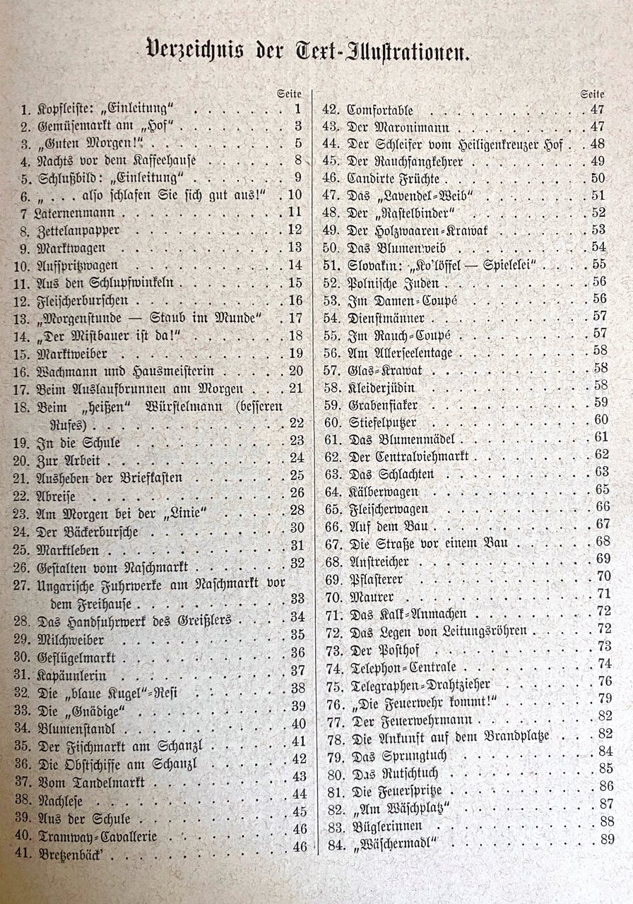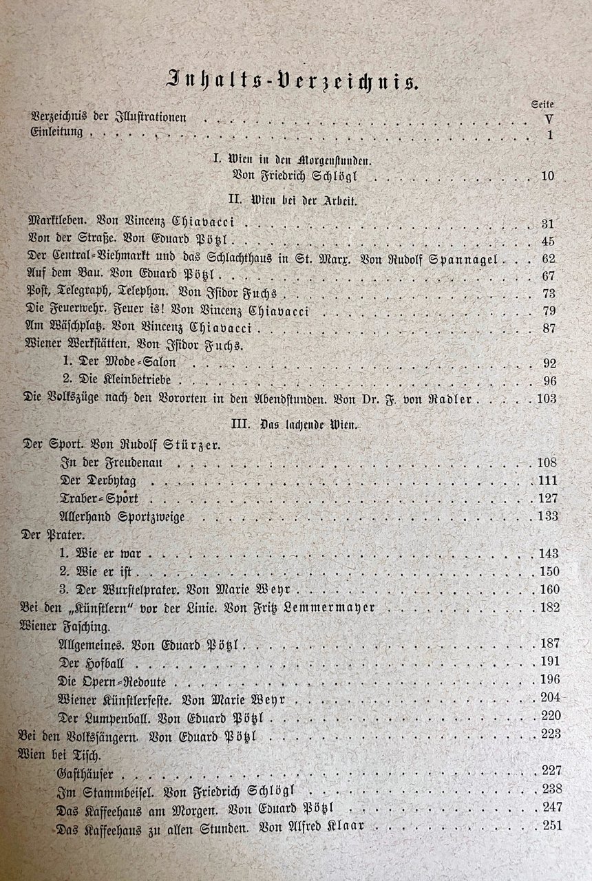 Soggetti: Sammlung von Schilderungen verschiedener Wiener Schriftsteller Ritratti di vita quotidiana contemporanea viennese Accademia Belle Arti Scrittori viennesi Illustrazioni Resoconti Viaggio Vienna Lavoro Strade Bestiame Macello St. Marx Cucina Luoghi Palazzi Piazze cittadine Posta Telegrafo Telefono Vigili del Fuoco Lavatoio Laboratori Salone Moda Piccole imprese Treni Sobborghi Sera Mattina Freudenau Derby Sport Trotto Cavalli Cavallo Equitazione Aristocrazia Borghesia Prater Com'era Com'è Wurstelprater Skünstler Carnevale Sacher Generale Ballo di corte Opera Feste Artisti Balli Stracci Cantanti popolari Tavola Osterie Ristoranti Trattorie Gastronomia Cibo Piatti tipici Bistrot storici Caffè Theater Kunst Wien Das Burgtheater Volkstheater Carttheater Teatri Arte Josefstadt Fürsttheater Musica classica Musei Cale Concerto Concerti Filarmonica Sala Bösendorfer Strauss Festival estivo Canto Società corale maschile Cantori Passeggiata Immagini Pubblico Sfilata Primavera Schmelz Cripta dei Cappuccini Chiesa Pasqua Settimana Santa Cresima Pellegrini Mariazell Scuola Studenti Biblioteche Educazione Soldati Vörse Giornali 18 agosto Corpus Domini Collocamento Monte di pietà Ghiaccio Neve Dintorni Ringstrasse Volksgarten Stadtpark Parchi Schrammel Nussdorf Agnes Brünn Benedizione Mercato Centrale ortofrutticolo Hof Lampionaio Bettelanpapper Carro cisterna Garzoni macellai Salsicciaio Fornaio Naschmarkt Carri ungheresi Freihaus Droghiere Lattaie Pollame Capponaia Chiosco Fiori Schanzl Pulci Tramway-Cavallerie Bagno turco Castagne Heiligenkreuzer Spazzacamino Frutta candita Lavanda Rastelbinder Krawat Ebrei polacchi Facchini Defunti Graben Lustrascarpe Lavandaia Ottocento Novecento Libri rari illustrati Vintage d'epoca fuori catalogo Chicche librarie Rarità Tedesco Lingua originale Disegni Collezionismo Da collezione Turismo Visitare Austria Cultura Fine XIX secolo Belle Époque Quadri Giornalismo Reportage Schizzi umoristici Cronache D'apparato Pregio Belvedere Divertimento Tempo libero Saggi Letteratura tedesca Visitatori Portraits Contemporary Everyday life Academy Fine Arts Writers Illustrations Reports Travel Jobs Work Streets Livestock Slaughterhouse Cuisine Places Palaces City squares Post Office Telegraph Telephone Fire Brigade Washhouse Workshops Salon Fashion Small businesses Trains Suburbs Evening Morning Trotting Horses Horse Riding Aristocracy Bourgeoisie As it was As it is Carnival Court ball Festivities Artists Dances Rags Popular singers Table Inns Restaurants Trattorias Gastronomy Food Typical dishes Historic bistros Cafés Theaters Art Classical music Museums Concert Concerts Philharmonic Hall Summer Singing Male choir Promenade Images Audience Parade Spring Capuchin Crypt Church Easter Holy Week Confirmation Pilgrims School Students Libraries Education Soldiers Newspapers Pawnshop Ice Snow Surroundings Parks Blessing Central market fruit vegetable Lamplighter Butchers apprentices Sausage seller Baker Wagons Hungarians Grocers Milkmaids Poultry Capon Coop Kiosk Flowers Fleas Turkish Bath Chestnuts Chimney Sweep Candied Lavender Polish Jews Porters Deceased Shoe Shiner Washerwoman 19th Century 20th Rare Illustrated Books from the Period Out of Print Bookish Gems Rarities German Original Language Drawings Collectibles Tourism Visit Culture Late Paintings Journalism Humorous Sketches Official Chronicles Valuable Entertainment Free Time Essays Literature Visitors