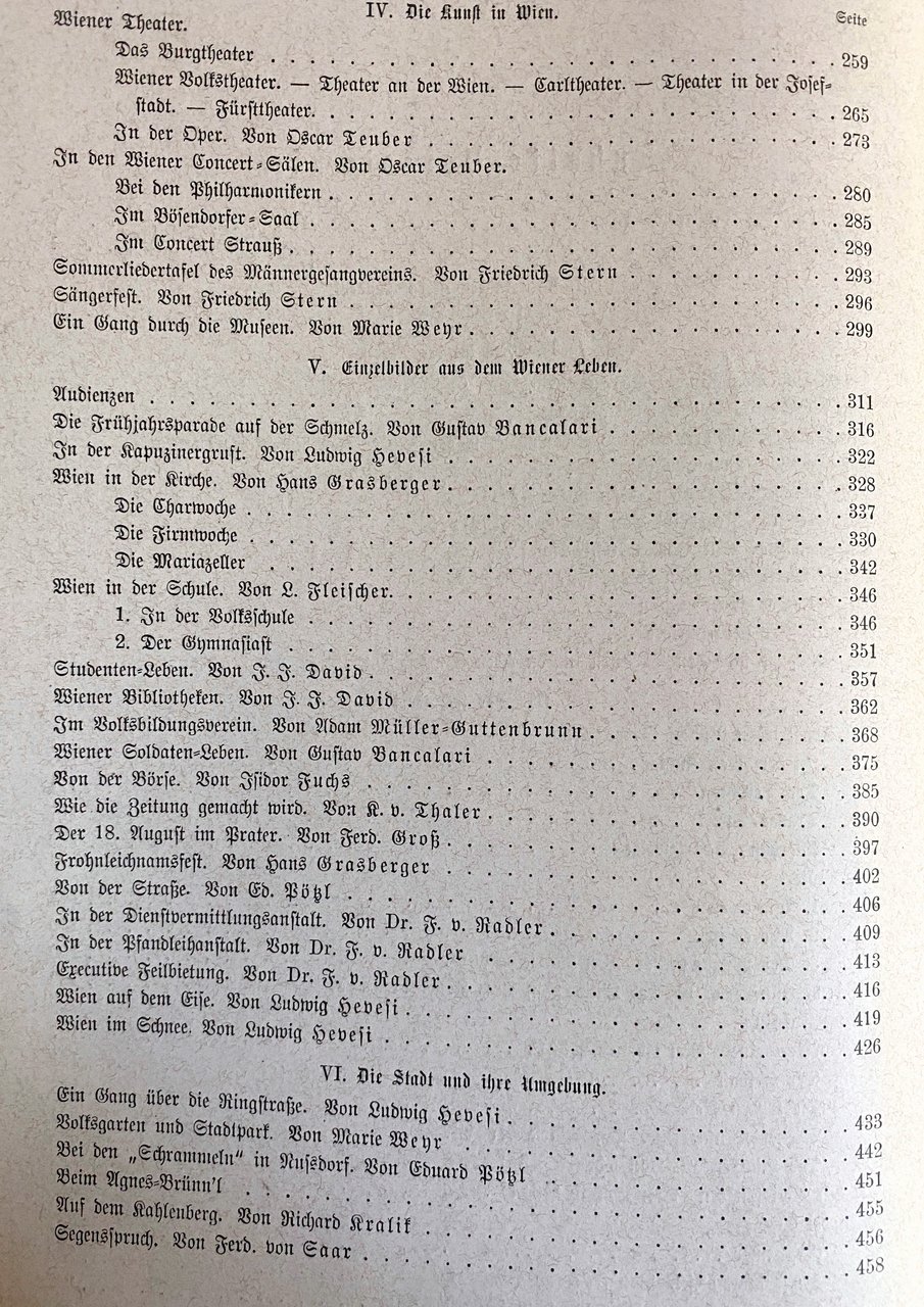 Autori Vari (Schriftstellern): Anton Mangold, Friedrich Schlögl, Vincenz Chiavacci, Eduard Pözl, Rudolf Spannagel, Isidor Fuchs, Dr. F. von Radler, Rudolf Stürzer, Marie Weyr, Fritz Lemmermayer, Alfred Klaar, Oscar Teuber, Friedrich Stern, Gustav Bancalari, Ludwig Hevesi, Hans Grasberger, L. Fleischer, J. F. David, Adam Müller-Guttenbrunn, K.V. Thaler, Ferd. Groß, Eduard Böyl, Richard Kralif, Ferd. von Saar