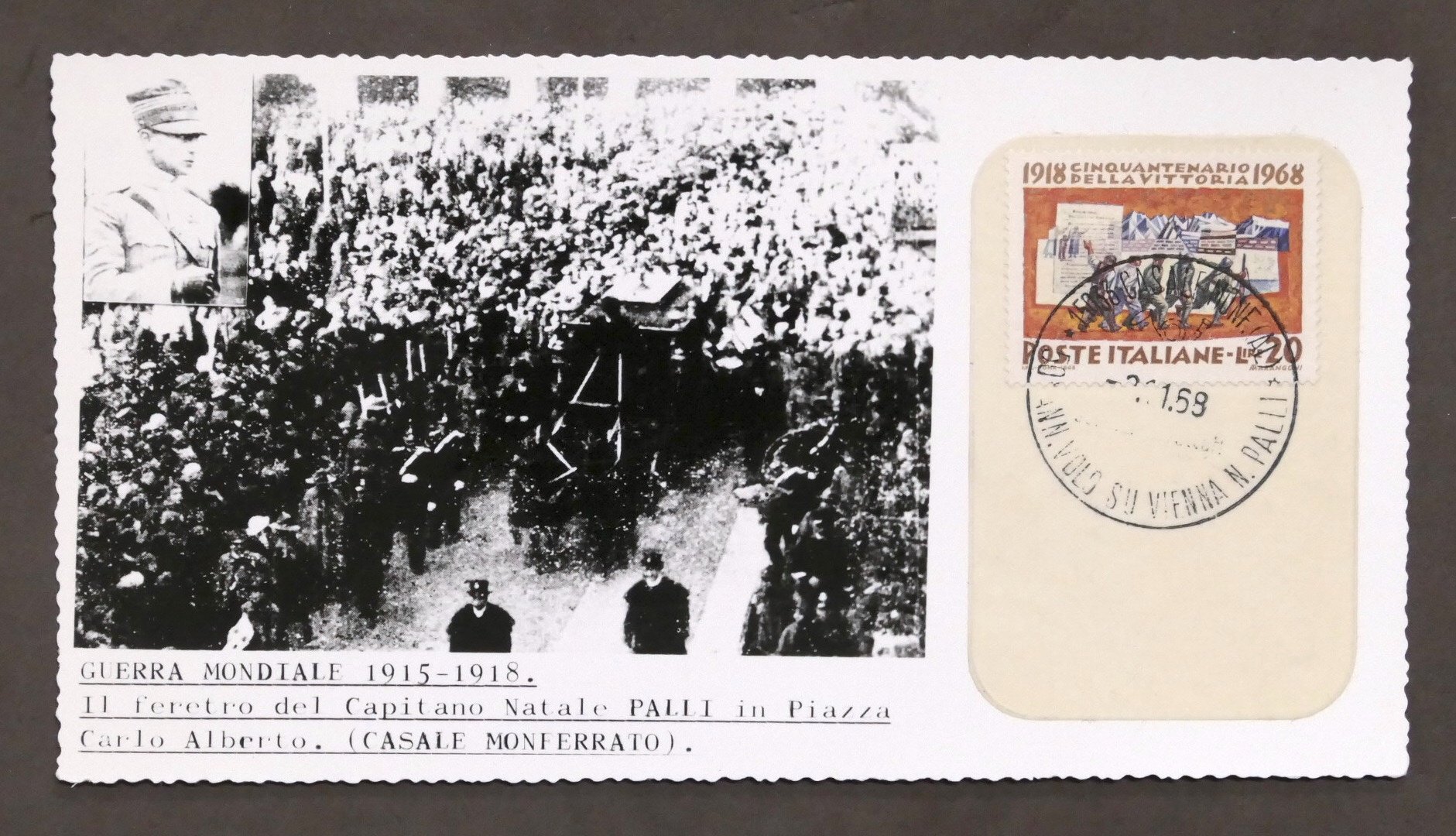 WWI - Fotografia con annullo postale - Funerali capitano Natale Palli - Cinquantenario della vittoria 1918-1968 Dimensioni: 9 x 17 cm ca. Condizioni molto buone.