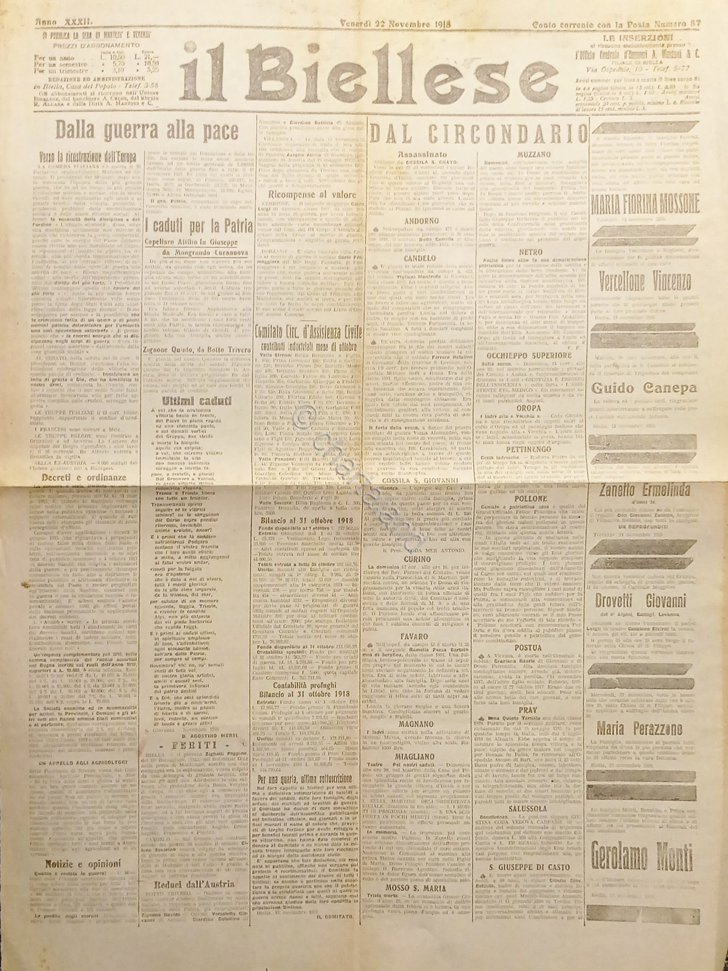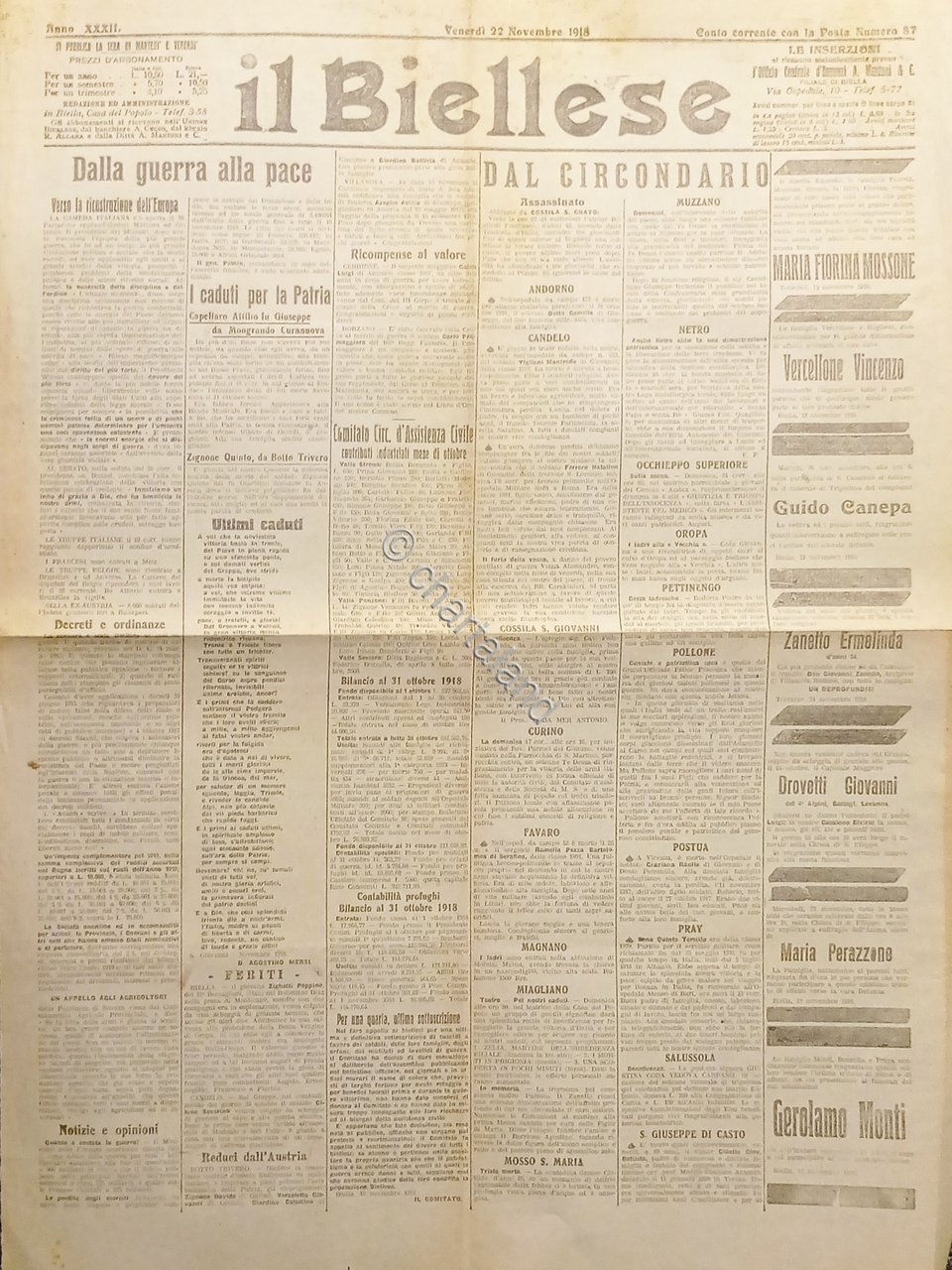 WWI - Quotidiano - Il Biellese N. 87 - 1918 Dalla Guerra alla Pace