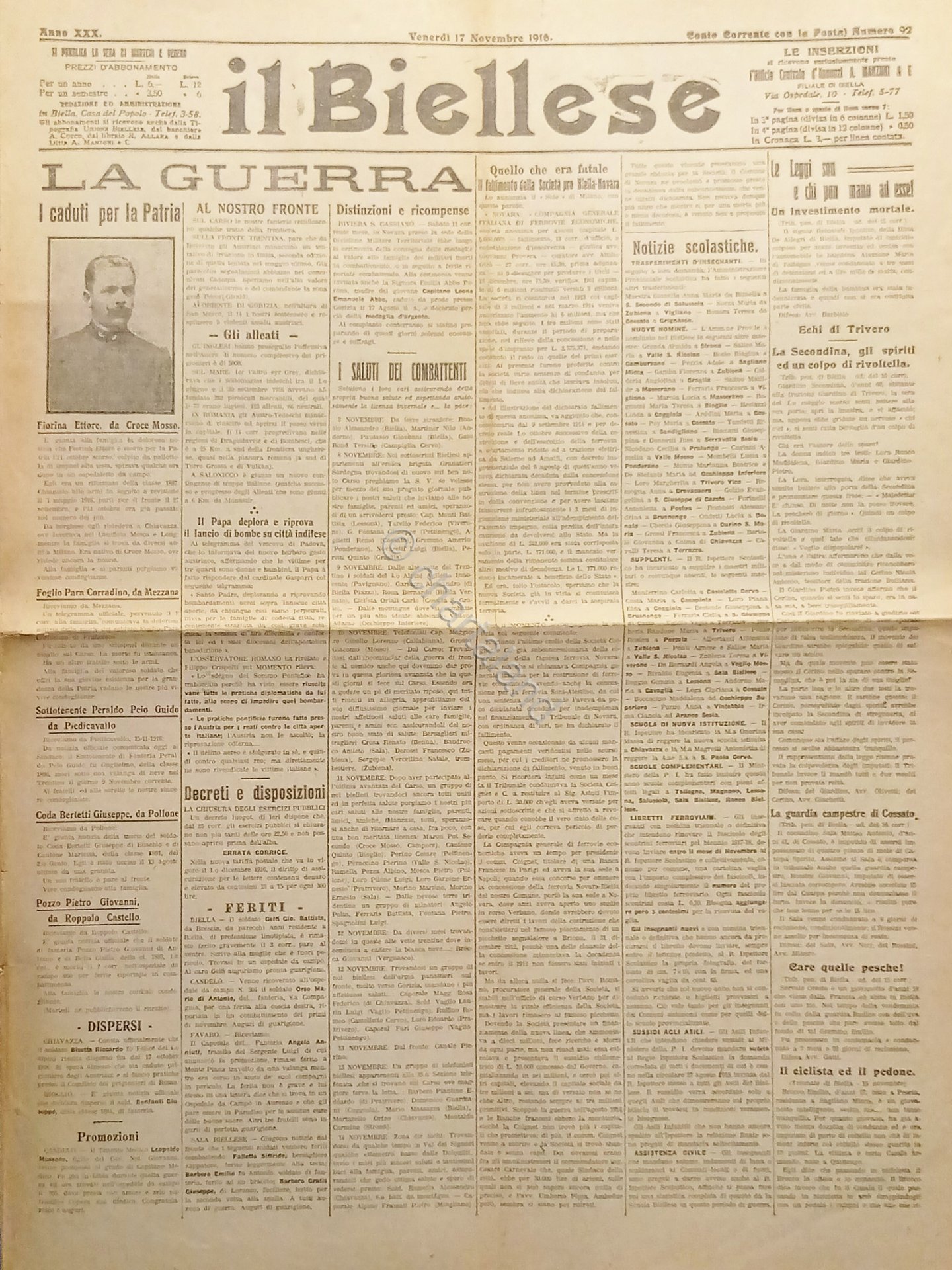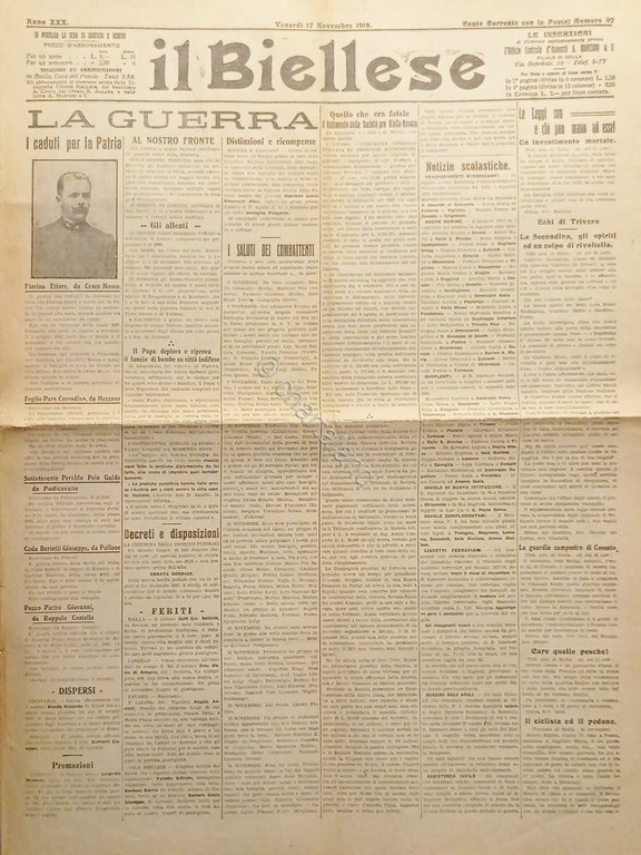 WWI - Quotidiano - Il Biellese N. 92 - 1916 La Guerra Testo in lingua italiana. Pagine 4 con illustrazioni. Condizioni discrete/buone con segni del tempo come da foto.