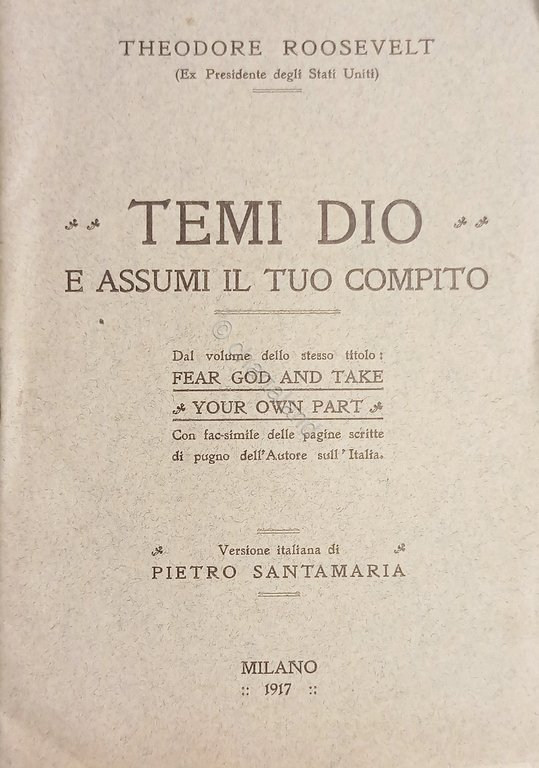 WWI - Th. Roosevelt - Temi Dio e assumi il tuo compito - ed. 1917 Testo in lingua italiana. Pagine 30 Copertina morbida. Condizioni molto buone.