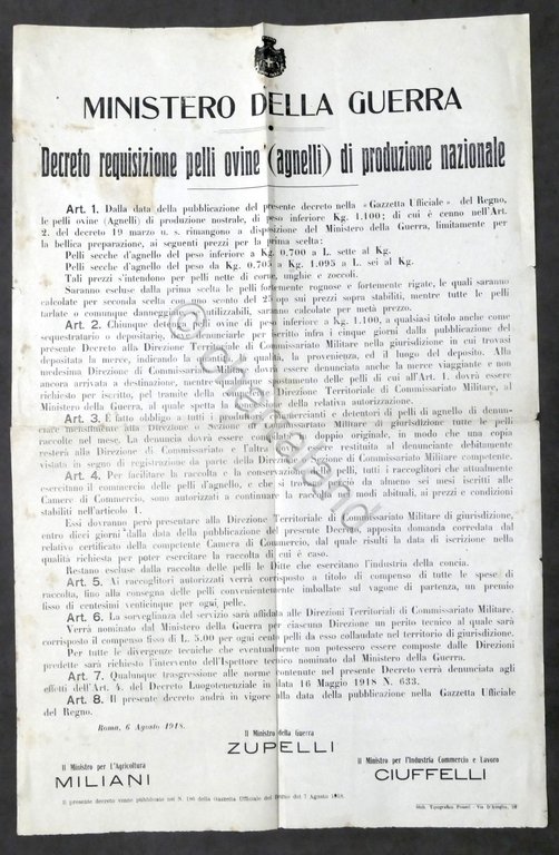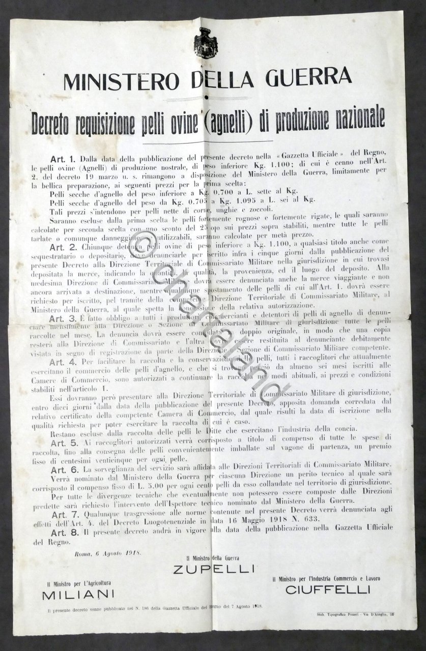 Ministero della Guerra - Decreto requisizione pelli ovine (agnelli) di produzione nazionale - Agosto 1918 Un foglio, dimensioni: 40 x 60 cm ca. Lingua italiana. Condizioni generali buone. Qualche strappo ai bordi e lievi macchie.