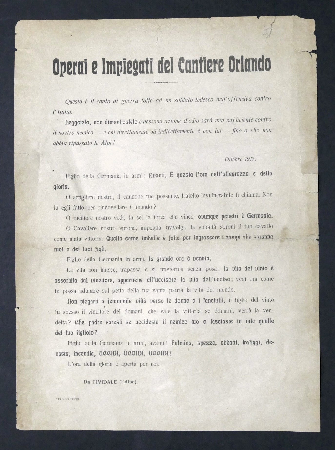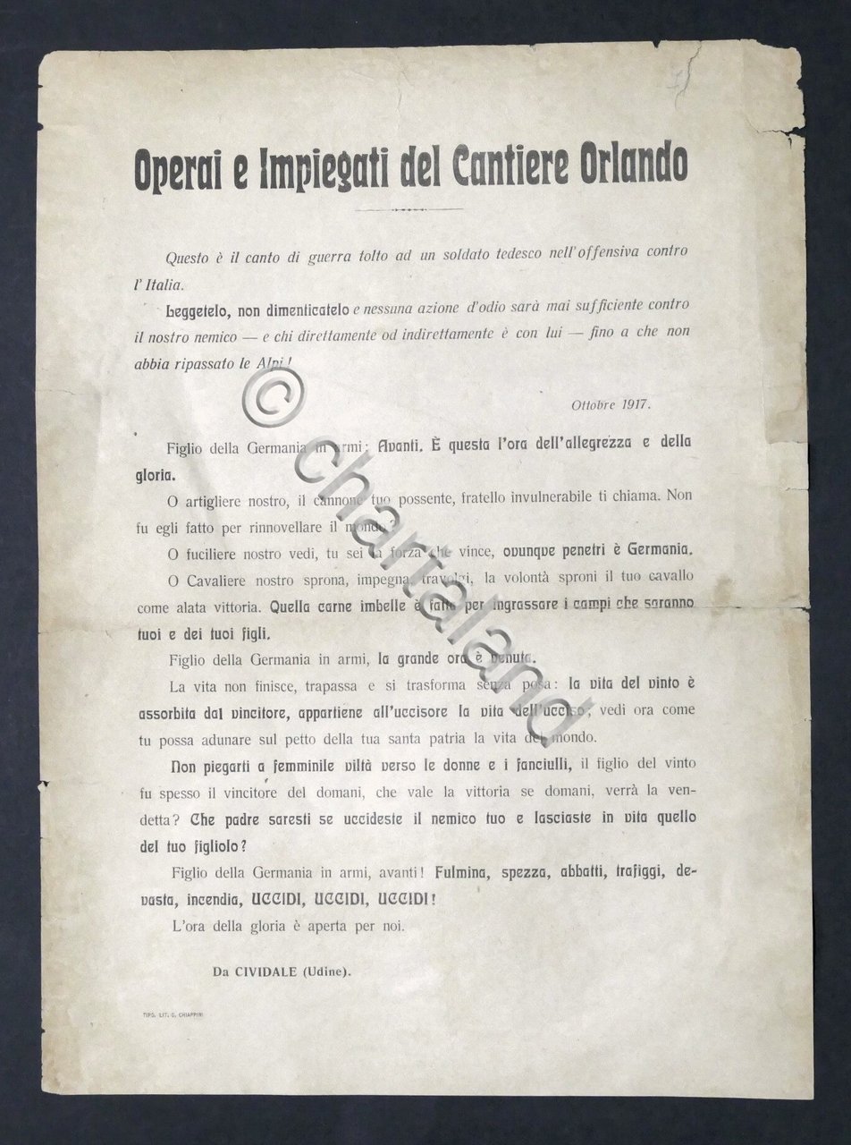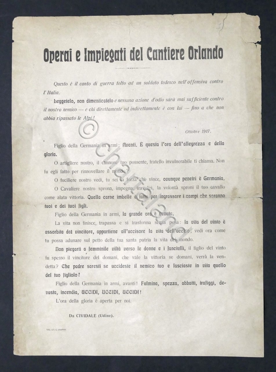 WWI Operai e impiegati del Cantiere Orlando - Udine - Volantino contro la Germania e il suo canto di guerra - Ottobre 1917 Un foglio più volte ripiegato, dimensioni: 49 x 62 cm ca. Lingua italiana. Condizioni buone. Piccoli strappi ai bordi.