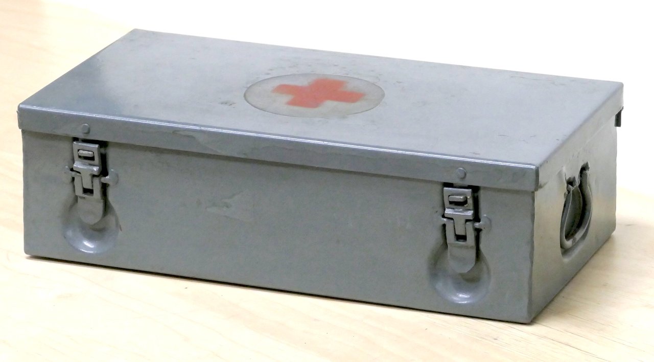 WWII - Cassetta Pronto Soccorso in metallo - Croce Rossa Esercito Italiano - anni '30-'40 Dotazione quasi completa - Circa 35 pezzi, come da foto Buone condizioni generali.