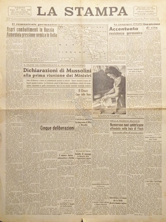 WWII - Quotidiano Torino - La Stampa N. 233 - 1943 Aspri combattimenti in Russia Testo in lingua italiana. Pagine 4 con illustrazioni. Condizioni molto buone.