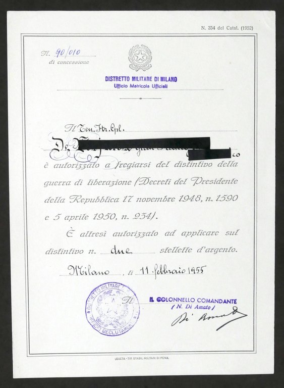 WWII Autorizzazione per distintivo guerra liberazione e per due stellette - 1955