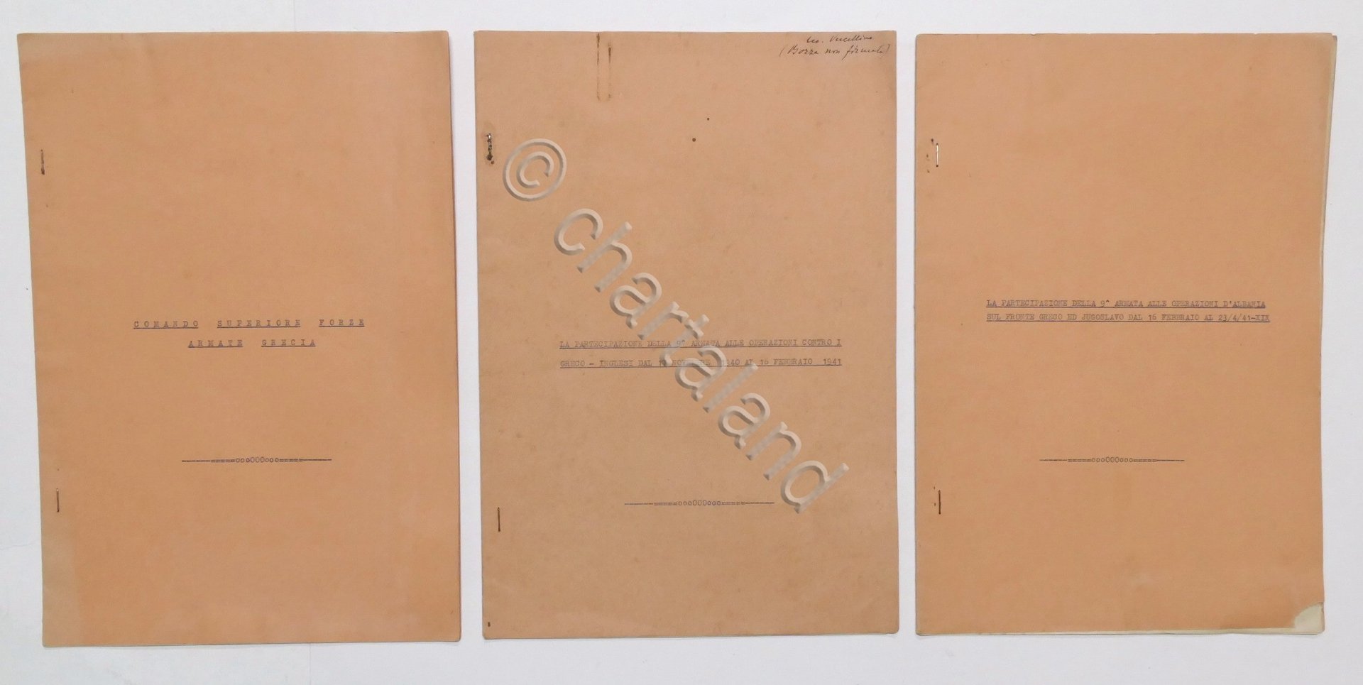 Esercito Italiano - 9^ e 11^ Armata - Informazioni sulle operazioni sul Fronte Greco - Iugoslavo e in Grecia 1940 - 1941 3 fascicoli dattiloscritti di 6 pagine cadauno. Copertina morbida - Testo in italiano. Condizioni molto buone.
