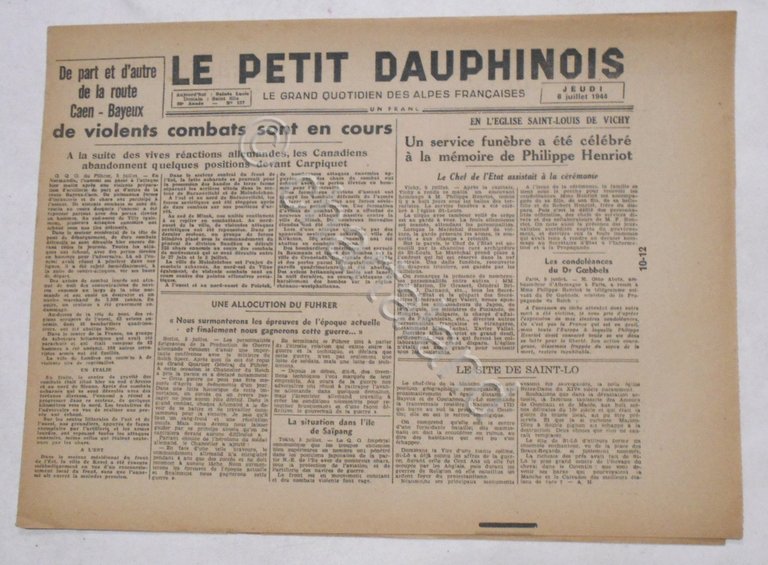 WWII Giornale - Le Petit Dauphinois N. 157 - 1944 Quotidien des Alpes Francaises
