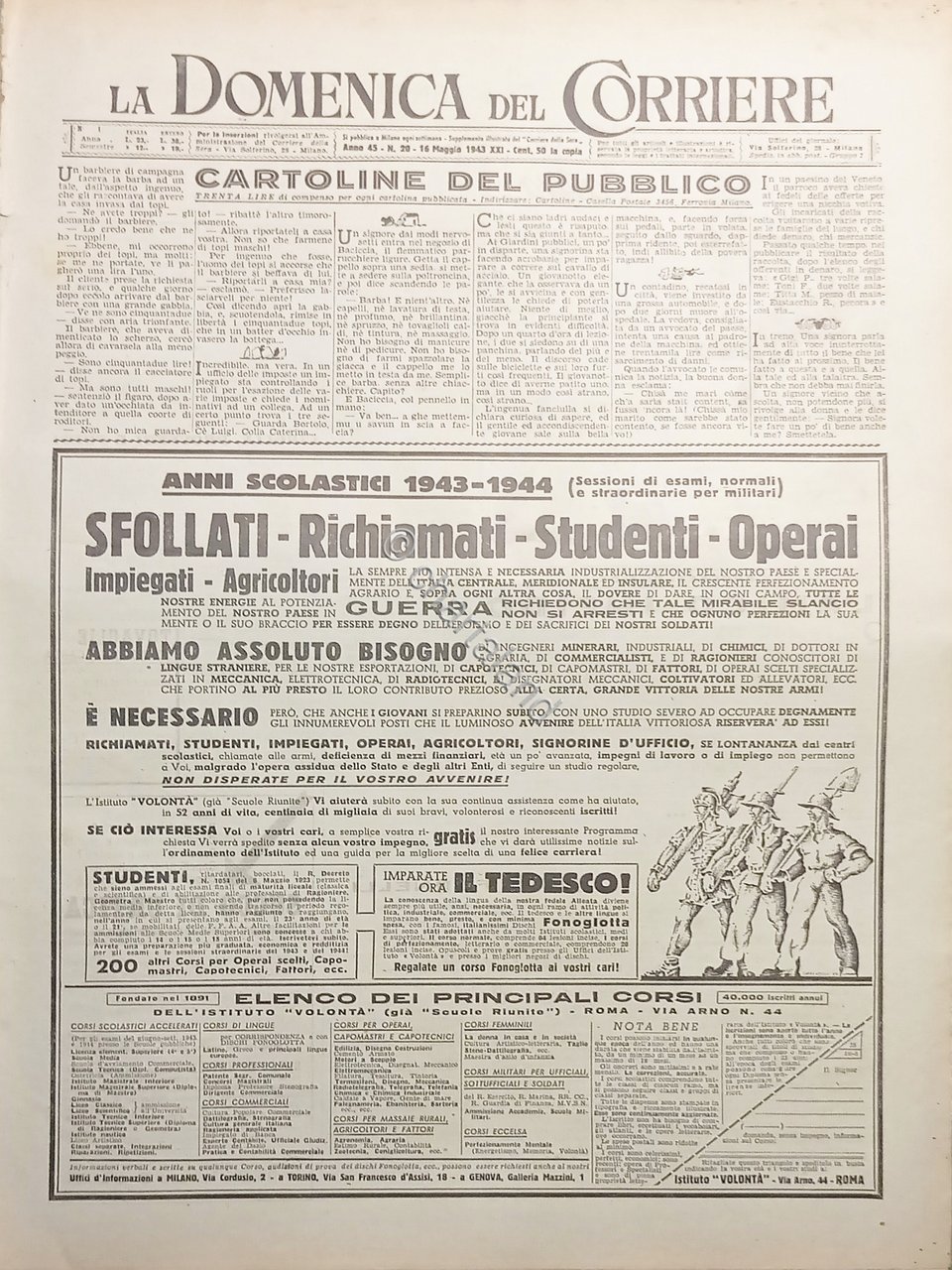 Supplemento illustrato del Corriere della Sera N. 20 - 1943 Testo in lingua italiana. Pag. 8 con illustrazioni Condizioni molto buone