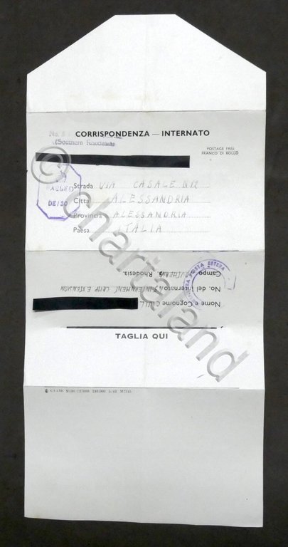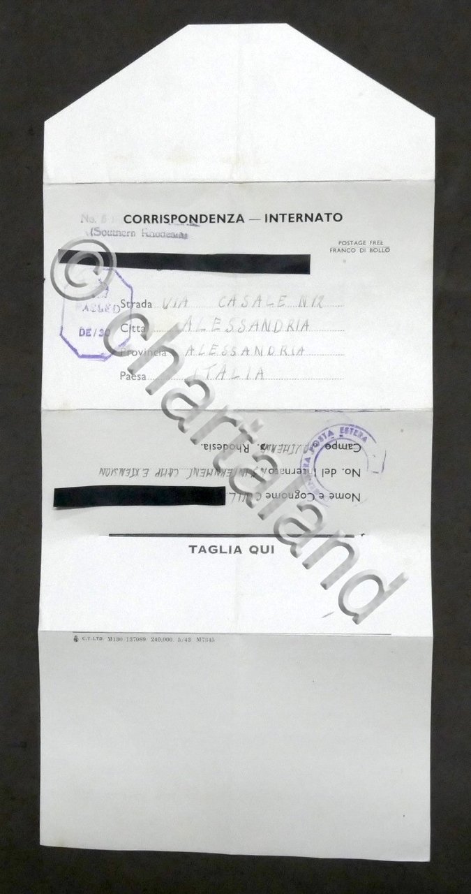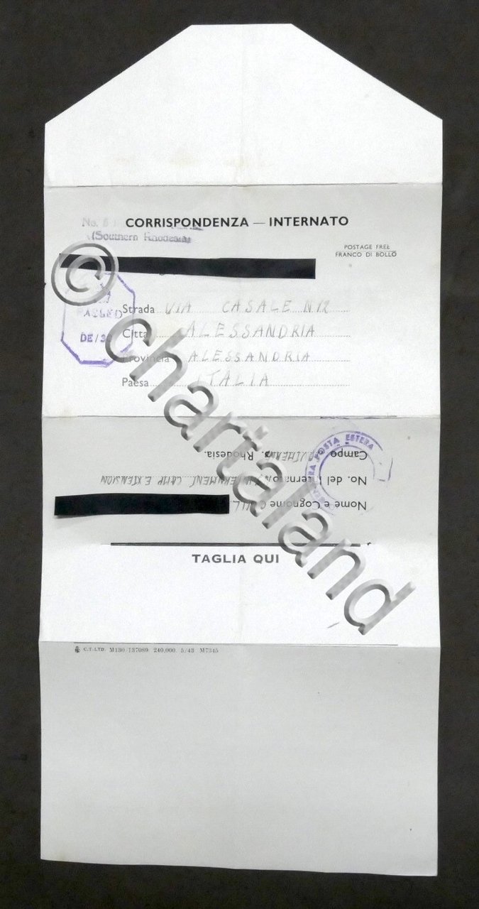 WWII Lettera internato italiano Campo concentramento N. 5 Sud Rhodesia 1943