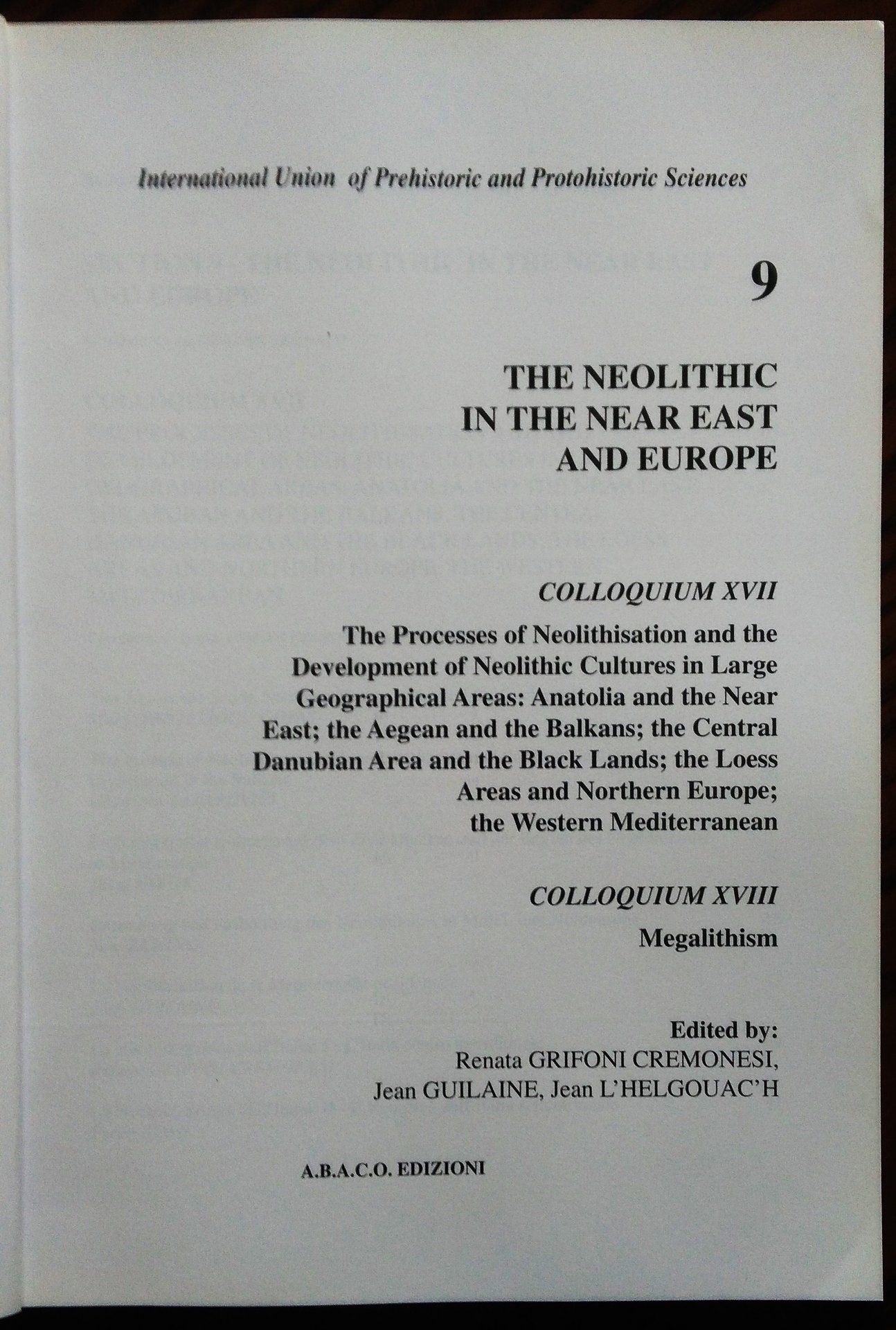 XIII International Congress of Prehistoric and Protohistoric Sciences: Forli (Italia) 8-14 September 1996 / 9 The Neolithic in the Near East and Europe. - Colloquium XVII - The Process of Neolithisation and the Development of Neolithic Culture in Large Geographical Areas: Anatolia and the Near East; the Aegean and the Balkans; the Central Danubian Area and the Black Lands; the Loess Areas and Northern Europe; the Western Mediterranean. - Colloquium XIII - Megalithism.