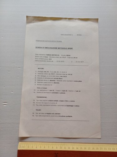 Yamaha RD 350 1975-77 scheda omologazione FMI Motociclo Sport originale