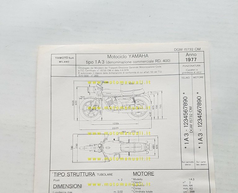 Yamaha RD 400 1A3 1977 scheda omologazione DGM originale Motorizzazione