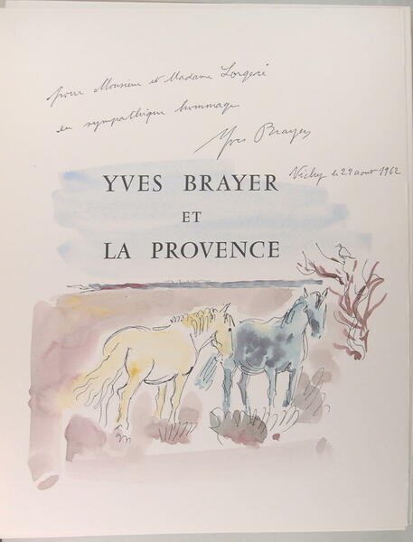 Arthaud, 1962. In folio en feuilles non paginé, sous chemise et sous emboîtage, 107 planches en noir et blanc et en couleurs, aquarelles, peintures, dessins. Exemplaire numéroté, notre exemplaire N° 1075, avec la dédicace de l'auteur et de l'illustrateur. Ouvrage enrichi sur la page de faux-tire d'une aquarelle originale en couleurs signée par Yves Brayer, de 1962.