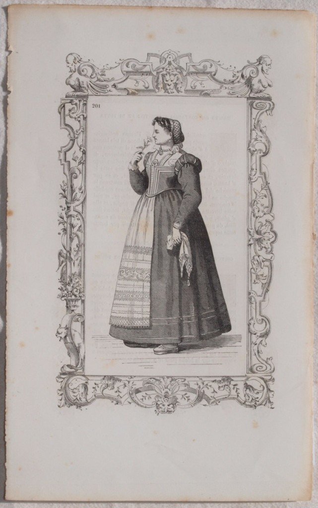 Deliziosa tavola xilografica proveniente dall'edizione ottocentesca della nota opera del 1590 "Habiti antichi et moderni di tutto il mondo di Cesare Vecellio". Le tavole, disegnate dal Vecellio sono riproduzioni dell'edizione cinquecentesca dell'opera. Lo scritto, fondamentale per lo studio sul costume ed abbigliamento di ogni genere e luogo, è universalmente celebrato come la più antica enciclopedia sui costumi. La tavola è impreziosita da testo esplicativo contenente notizie e curiosità. INCISIONE: xilografia AUTORE: Cesare Vecellio DIMENSIONI PASSEPARTOUT: cm 23x14,50 DIMENSIONI INCISIONE: cm 16x10,5 EPOCA: 1859 CONDIZIONI: buone condizioni, usure al margine sinsitro, rare fioriture Al verso della tavola presente testo esplicativo che non corrisponde alla planche in questione Viene fornita copia anastatica della corretta spiegazione della tavola. Testo italiano e francese. Nice woodcut coming from the edition of the XIX century of the famous work of 1590 "Habiti antichi et moderni di tutto il mondo di Cesare Vecellio". The planches, drawn by Vecellio are reproduction of the XVI century edition of the work. The writing, important work about the costume and appearel of each kind and place, is universally celebrated as the most ancient aencyclopedia about costumes The planche is enriched by explicative text containing curiosities and information. ENGRAVING: xilography AUTHOR: Cesare Vecellio PASSE-PARTOUT DIMENSION: cm 23x14,50 ENGRAVING DIMENSION: cm 16x10,50 DATE: 1859 CONDITIONS: good; wearings in the left edge and occasional foxings In the verso of the planche there is the explicative text not corresponding to this planche. We provide anastatic copy of the correct explanation. Italian and french text.