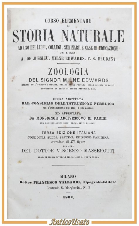 ZOOLOGIA di Milne Edwards 1862 Vallardi Storia Naturale Libro Antico