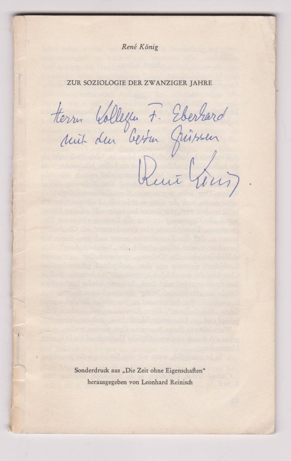 Zur Soziologie der Zwanziger Jahre. (Mit Widmung und Signatur des Autors!).