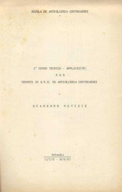 2° CORSO TECNICO APPLICATIVO PER TENENTI IN S.P.E. DI ARTIGLIERIA CONTROAEREI. Quaderno notizie. Sabaudia (1/7/1957 - 30/9/1957).