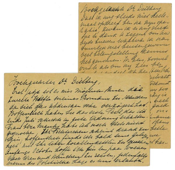 Zusammen (2+2 =) 4 SS. auf 2 Bll. Jeweils mit eh. Adresse. An den Dramatiker und Kunsthistoriker Franz Dülberg (1873-1934): "Erst jetzt ist es mir möglich Ihnen die zweite Hälfte meines Bandes [?] zu schicken, da sich das Abdrucken sehr verzögert hat. Hoffentlich haben Sie den ersten Teil, den ich Ende Juli schickte in guter Ordnung erhalten [.]" (8. IX. 1922, harmonisierte Umschrift). - Die zweite Karte auf Niederländisch.