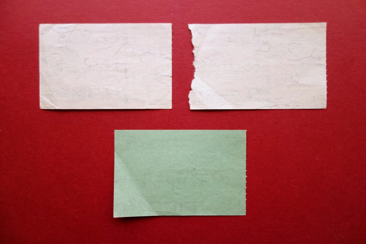 3 biglietti, Tre biglietti partita di calcio Modena FC campionato nazionale di serie B 1976-1977 (due ingressi in curva e uno in tribuna) Tre biglietti originali per partita di calcio, con grafica a colori; margine sinistro con tratteggio per distacco singolo; un bigletto con ancora il tagliando (vedi foto). Cm 5,5x8,5. Condizioni di conservazione Biglietti tutti e tre ben conservati con tracce d'uso, qualche minima traccia di piega; margine esterno destro di un biglietto con piccola mancanza (vedi foto). SC03.D16151 N
