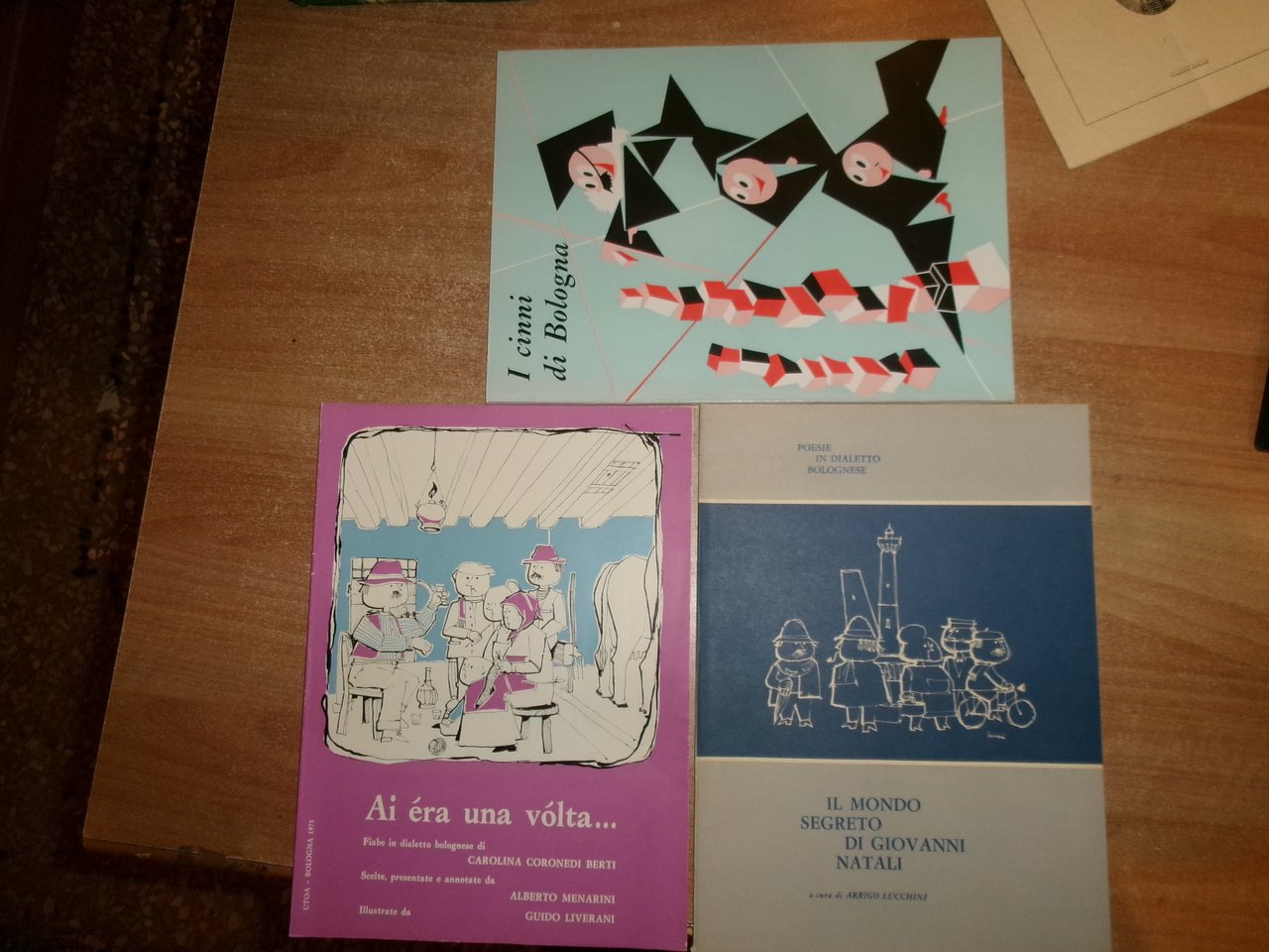 AA. VV. Bologna, Arti Grafiche Tamari/U.T.O.A., 1966 - 1971. 3 volumi in-8° grande, br. ill. a col. I cinni di Bologna. Ai éra una volta. Il mondo segreto di Giovanni Natali. Poesie in dialetto bolognese. 44 pp. + numerose pagine di pubblicità dell' epoca.; 47 pp.; 49 pp. I tre volumi sono illustrati. Ottimo stato di conservazione. Neg. Bol. mob. 20 entro busta trasp.