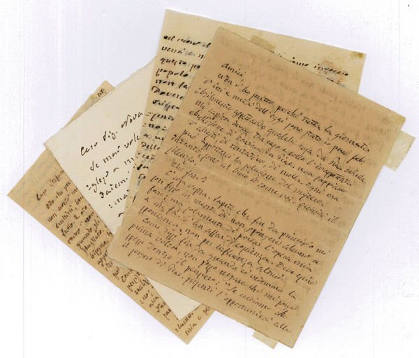 Small 8vo. Altogether 7 pp. on 4 double leaves. One letter to his sister (15. II. 1870), one to Sig. Nova, one to Stefano, and one to an unnamed "amici". - Accompanied by a lithographic portrait; mostly written on very thin paper with small damages to edges and traces of mounting. - Letter to the "amici" / friends from the end of the first page to the end of the letter: "Come dissi fin da quando ci vedevamo la / prima volta, non posso negare che mi sorge / spesso dentro il pensiero: 'Se vediamo che / il sorgere di Piac. presenti l'opportunità alle / città d'Italia, perché non lo potrà il sorgere di / Genova?' Non posso a meno di ripetere / questo pensiero; ma più in là non vedo. L'amico vi dirà dell'Ufficiale che lo / veduto questa mattina. Appena io abbia notizie, le avviso. Se per / caso credete di determinarvi a fare, avvertite-/mi senza indugio. Darò allora i proclami e vi / vedrò subito. Il Governo ha evidentemente paura. E non / osa appigliarsi a misure anteriormente repres-/sive. V' è agitazione, come sapete, anche nel / macinato. Il Governo nondimeno presente il moto da / parte nostra. E questo potrebbe forse modificare / il disegno e dare più importanza alla mia / idea d'assalire le ali, procacciare armi e / portar poi le forze concentrate ed eccitate da / una vittoria sul centro. Ma di questo si / parlerebbe. Vostro tutto Gius M". - "As I have said since we have met for / the first time, I cannot deny that the thought / occurs to me often: ' If we see that / the rising of Piac. shows the opportunity for / the cities of Italy, why could the rising of / Genova not do the same thing?' I cannot stop to repeat / this thought; but I do not see any more in it. The friend will let you know from the Officer that I saw him / this morning. As soon as I have news, I will let you know. In / case you believe you will make up your mind to act, let me know / without delay. I will then give a proclamation and I will / see you immediately. Obviously, the Government is afraid. And it does not / dare to cling to measures which were repres-/sive before. There is agitation, as you know, even in / the crushed. Still, the Government presents the stimulus for / us. And this could maybe change / the plan and give more importance to my / idea of attacking the wings, procuring weapons and / then leading the concentrated and excited forces to / a victory over the centre. But we will talk / about this. Yours entirely Gius M".