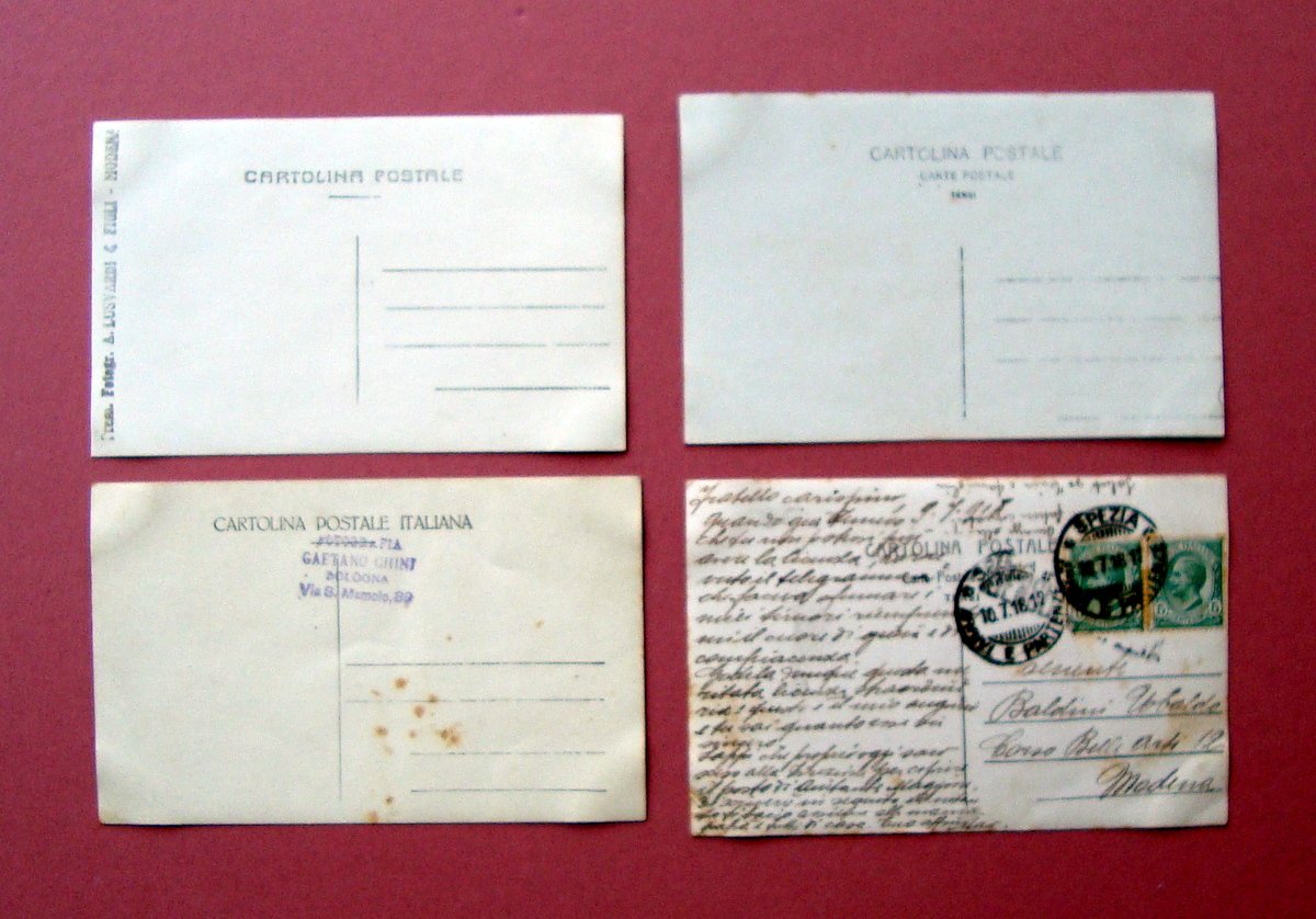 4 Fotocartoline, Messa Cannoni Rilevamenti Topografici 1 viaggiata 1918 Fotocaroline in bianco e nero, cm 9x14 c.a cad.; tutte periodo Prima Guerra mondiale, 1 viaggiata 1918. Condizioni di conservazione Esemplari in buone condizioni con tracce del tempo; piccoli difetti agli angoli, una con macchiette al retro; per dettagli vedi foto. SC03.D19111 blu