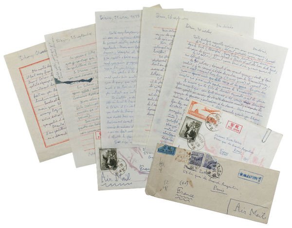 8vo and oblong 4to. Together 6 pp. With autograph envelopes. Highly interesting correspondence with his wife during a trip to China as member of a delegation of the Association des amitiés franco-chinoises which also included his friends Jean-Paul Sartre, Simone de Beauvoir (here addressed by her pseudonym "Castor"), and the painter Jean Lurçat. - In the first letter, dated 22 September, Leiris recounts their stay in Moscow and the journey to Beijing via Siberia, expressing his enthusiasm over a production of Swan Lake at the Bolshoi Theatre with Nikolai Bulganin, Nikita Khrushchev, and Otto Grotewohl, the prime minister of the GDR, in attendance. In closing, Leiris asserts that they will have to adapt to the Far East culturally: "Dorénavant, il faudra que nous nous arrangions pour prendre nos habitudes dans l'Est : c'est sans commune mesure avec le reste". A charming extra is an ink blot with the added explanation: "This stain is because I am writing you with a Chinese pen". - On 27 September, Leiris mentions a thirty-course dinner organized by the vice-minister for cultural relations and an upcoming visit to the Forbidden City. He now writes that interactions with Chinese people "are perfectly normal" despite "the exotic scenery", which he contrasts with his experiences in African and Caribbean countries: "Le plus étonnant en Chine c'est, décidément, qu'on y est absolument pas dépaysé, en dépit de tout l'exotisme du décor. Cela tient au fait qu'avec les gens les rapports sont parfaitement normaux et non pas ce qu'ils sont dans les pays africains ou antillais". - A letter that is erroneously dated "30 October" can be dated to 30 September, based on the content: Leiris gives his wife details concerning the programme of the coming weeks and his departure on 30 October that make no sense otherwise. Further, he describes preparations for large festivities on the following day, which certainly refers to the official celebrations of the Chinese National Day on 1 October 1955: "As tomorrow's party approaches, it is getting more and more magnificent: a huge crowd must have spent at least most of last night outside, watching the youth groups practicing their dances." A large "banquet for some 2,000 guests" the previous night, "presided over by Zhou Enlai", then First Premier of the People's Republic of China, was probably also connected to the festivities. A famous photo shows Simone de Beauvoir and Jean Paul Sartre on Tiananmen Square during the official celebration of the National Day. - On 5 October, Leiris writes from Changchung in Manchuria, a region that "feels a bit like the end of the world", and he is astonished "to see industrial buildings here". - Sartre and de Beauvoir were to depart for Shanghai the following day in order to organize accommodation for the rest of the delegation. The correspondence only resumes on 21 October 1955, after Leiris returns to Beijing from a trip to Shanghai and Hangzhou and before a further visit to Yunnan province. He reports on delegations from the "worker's club of the Beijing Opera Company no. 3", by whom they had been given an "overwhelming" welcome and "were even dressed up in Chinese actors' costumes and given large beards for photographs". Situations such as these make Leiris wonder how to convey his experiences without having people back in Europe think them mad: "Tout ce qu'on voit ici est suffoquant et la difficulté sera, au retour, de le faire saisir à ceux qui, ne l'ayant pas vu, nous regarderons comme des fous". - The correspondence forms a beautiful and thus far unpublished addition to the posthumous publication of Leiris's travel journals, the 1994 "Journal de Chine". - Three letters on lined stationery with a print of a pomegranate.